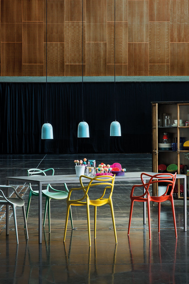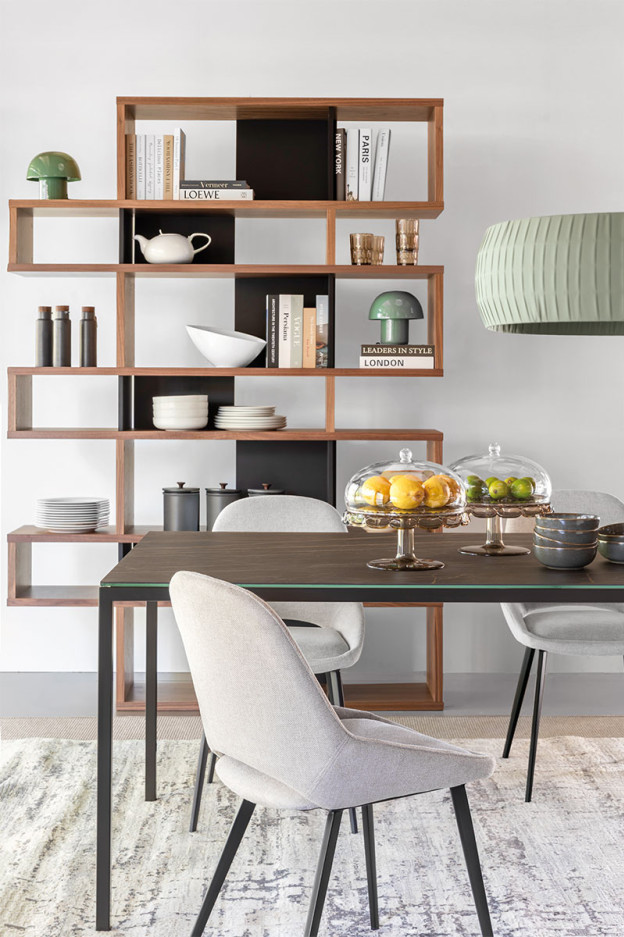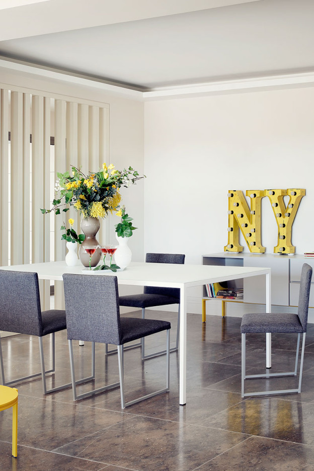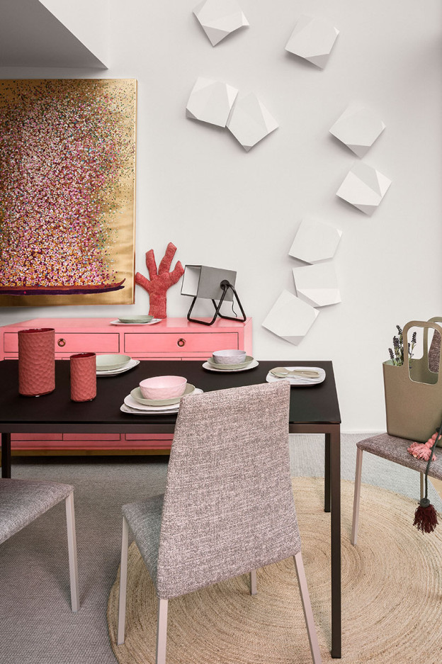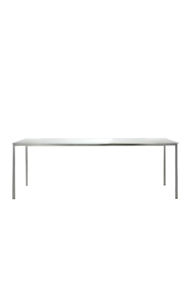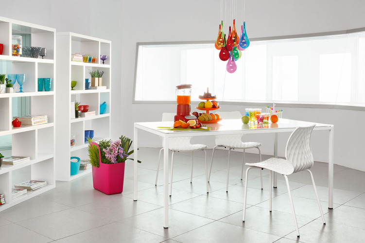 Mesa de comedor con estructura de acero lacada en varios acabados mates y sobre de vidrio o cerámica disponible en varios acabados.