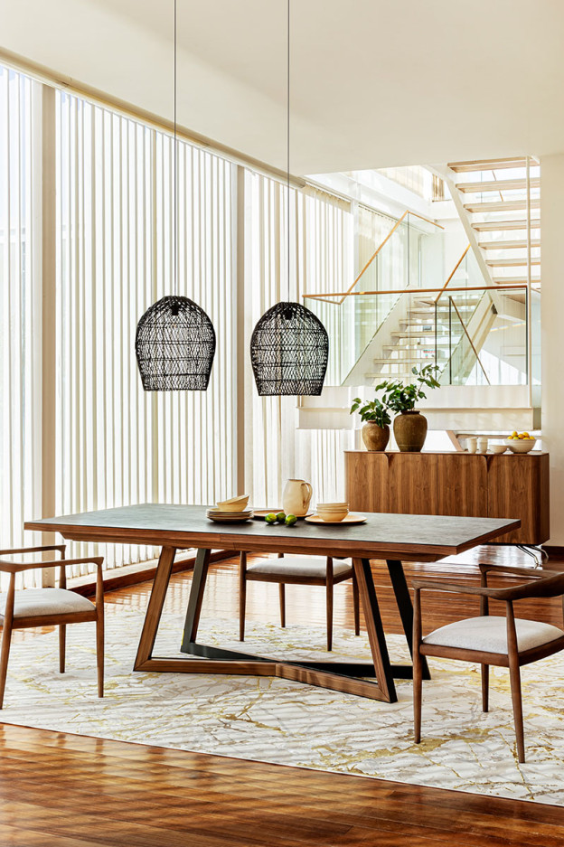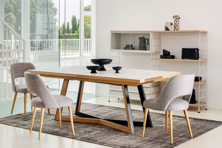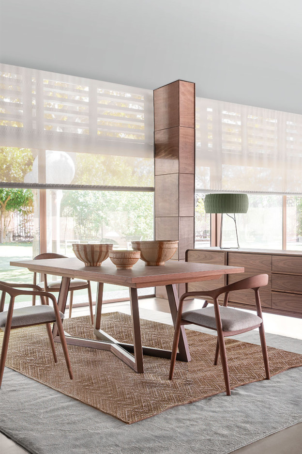 Nuestra mesa de comedor Mar es elegante y sofisticada con pata mixta de madera de roble o nogal y metal. El sobre de nuestra mesa Mar es de madera chapada en roble, nogal, puede ser lacada en varios colores o cerámico en varios acabados, para que puedas crearla combinándola a la perfección con la decoración de tu hogar.