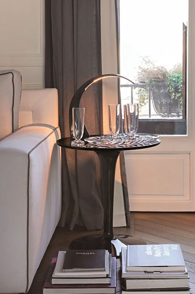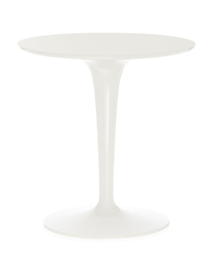 Tip Top es una pequeña mesita auxiliar, ágil, ligera y versátil, formada por una estructura realizada en una única pieza sobre la que se apoya un tablero sólido redondo. La combinación de tablero de color y pata transparente y hueca dona profundidad a la estructura. El tablero está disponible en una amplia variedad de colores brillantes, transparentes u opacos. Medidas: 48 cm diámetro x 51 cm altura. Diseño de Philippe Starck con Eugeni Quitllet.