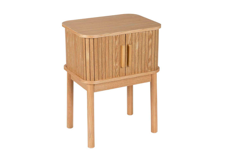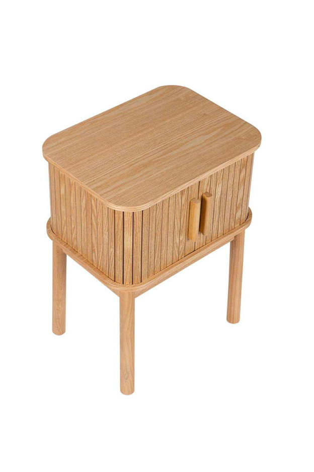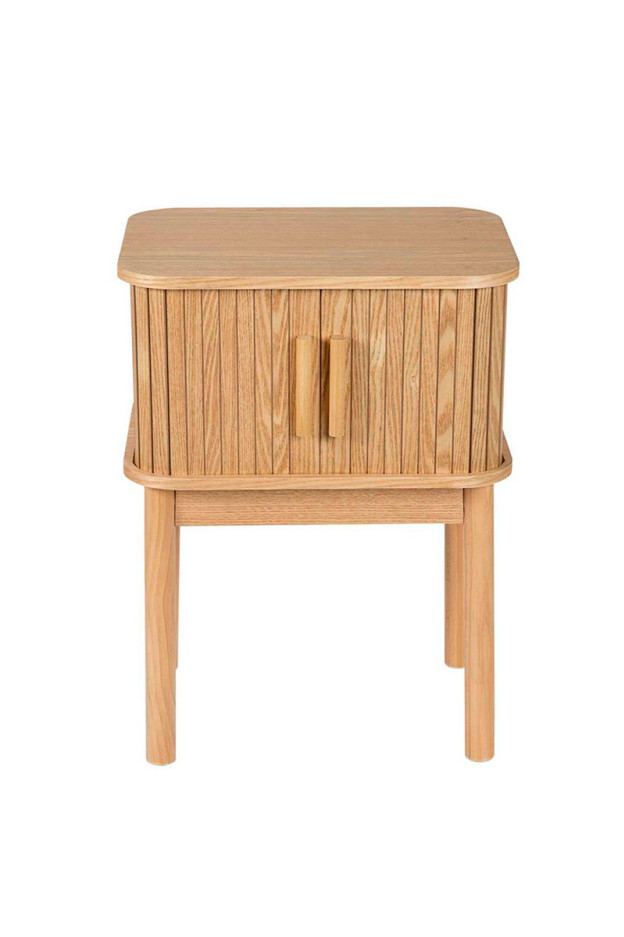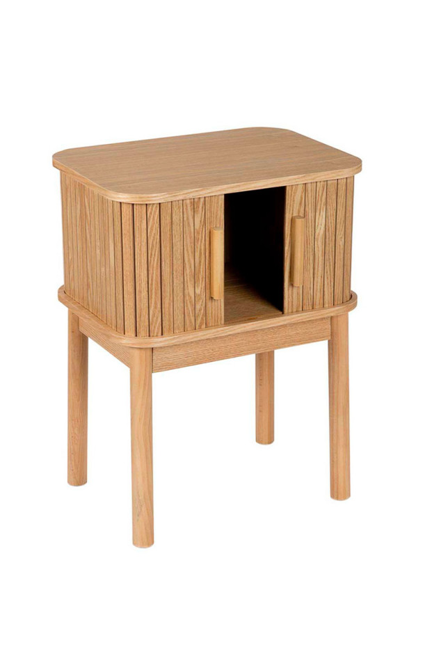 Esta mesa de noche aportará toques más naturales y diferentes a las mesas de noche más convencionales gracias a las puertas correderas que esta comprende. Fabricado en fresno, fibras de densidad media y patas de pino.
