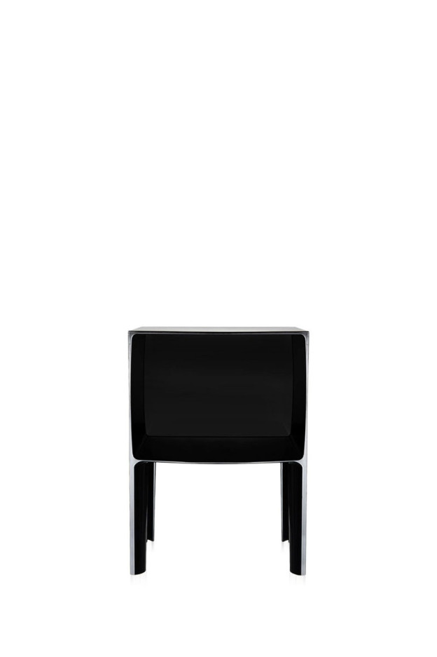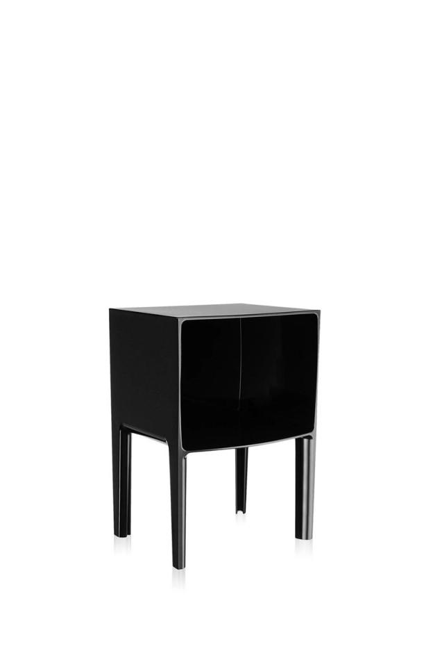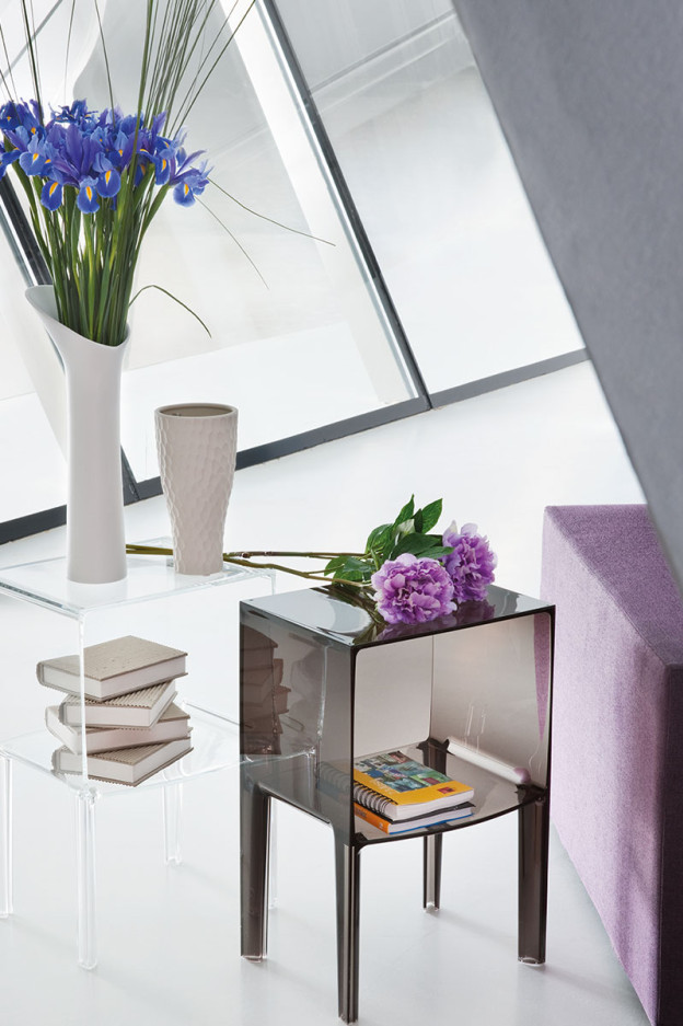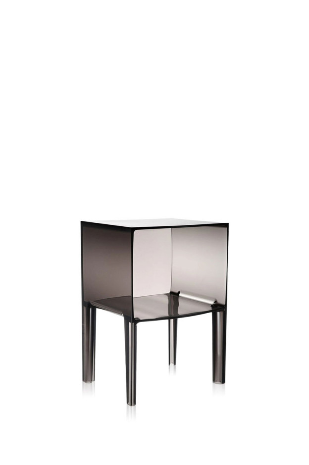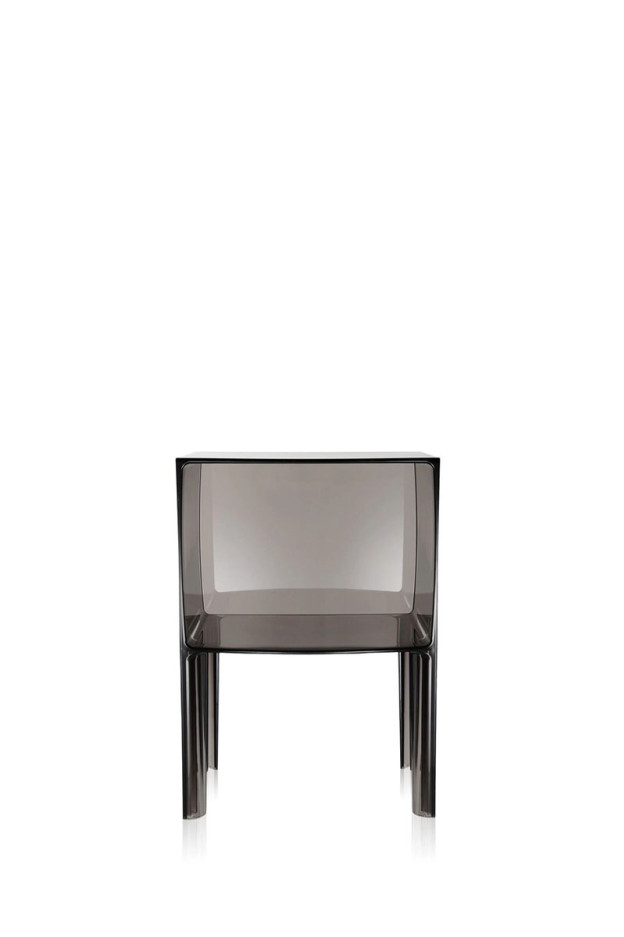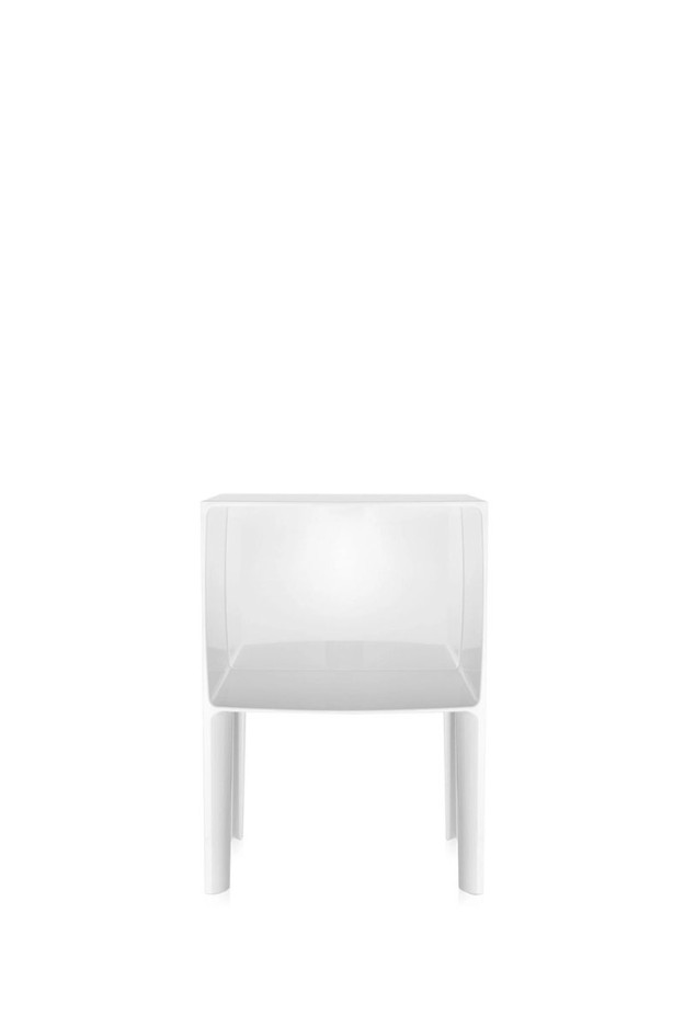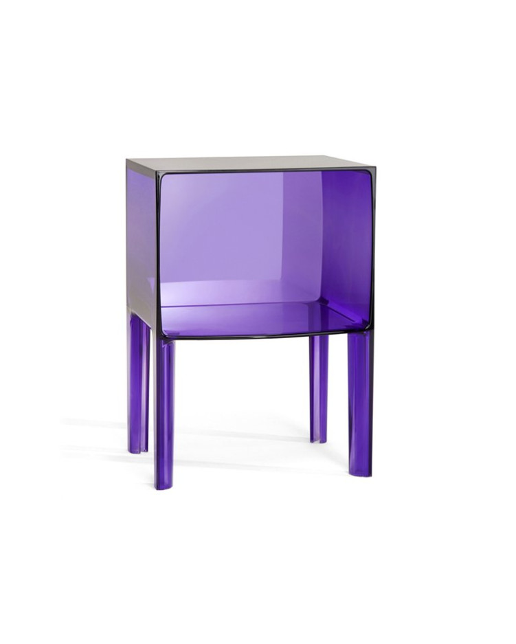 Versión de mesita de noche de la cómoda Ghost Buster. Un pequeño cubo cuadrado apoyado sobre cuatro patas, disponible enteramente en transparente, en color o en mate, y realizado con material plástico.