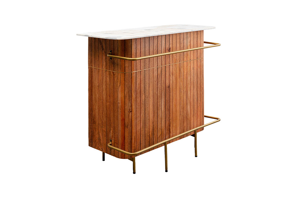 Está fabricado en madera maciza y mármol. Sus pasamanos y reposapiés en acero con acabado en latón.