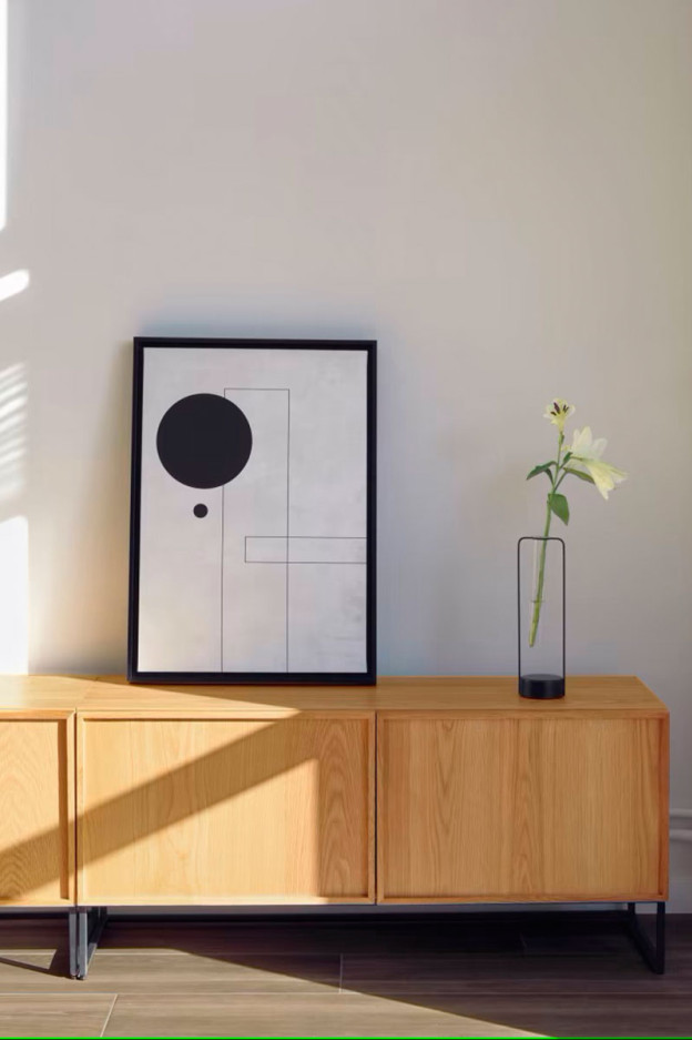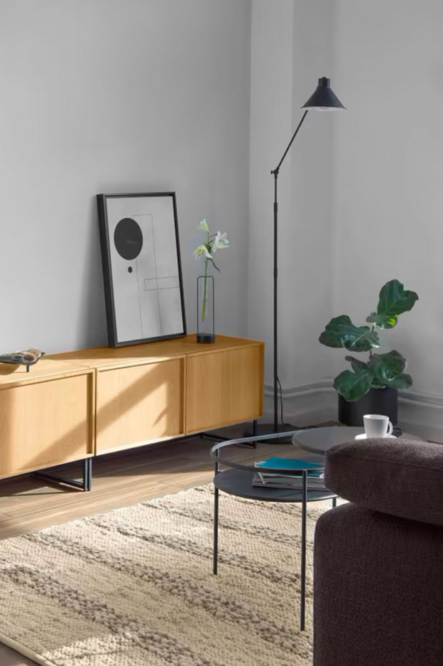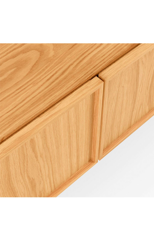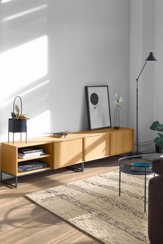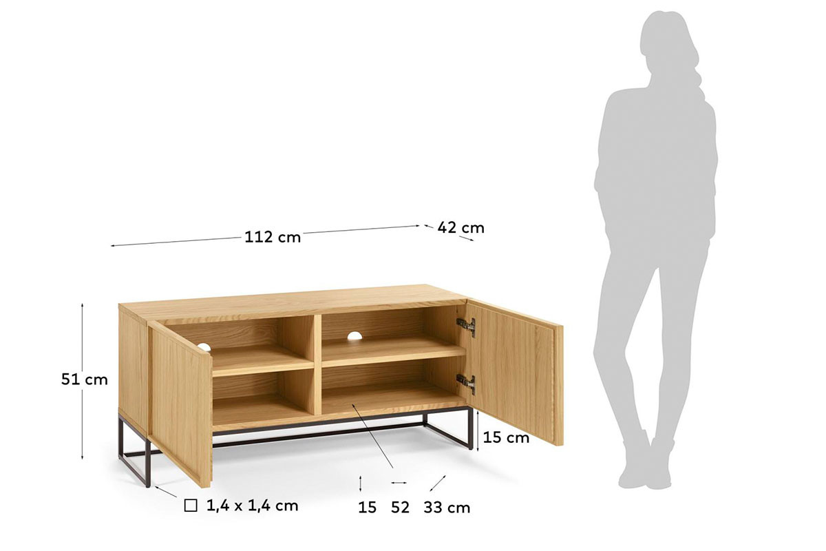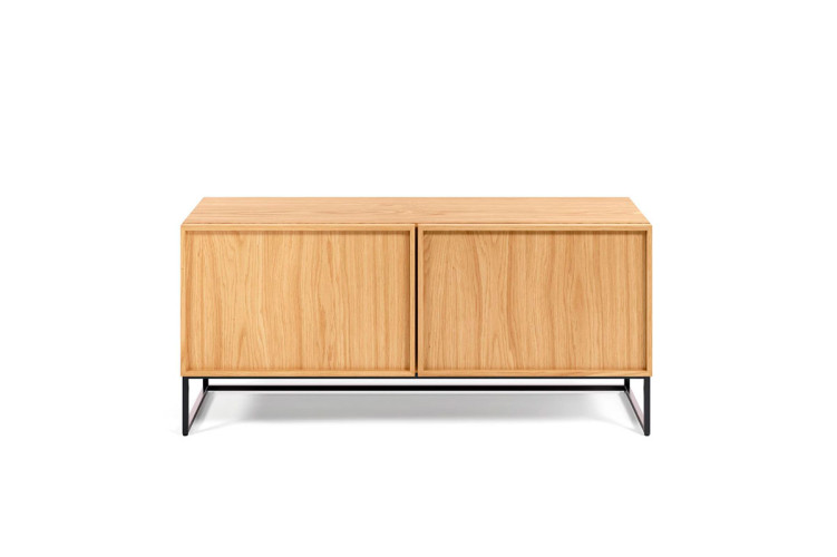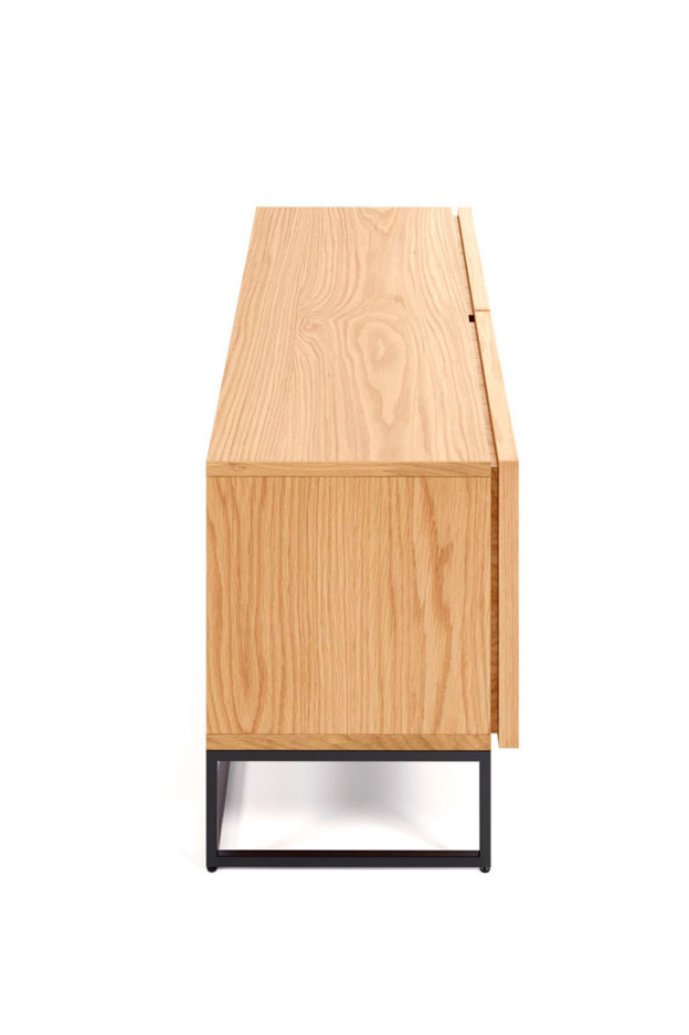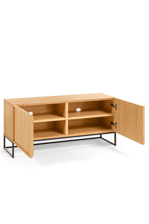 Mueble TV con chapa de roble y madera maciza de roble. Estructura de acero negro. Disponible en diferentes modelos.
