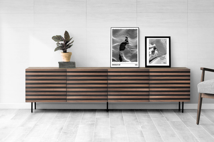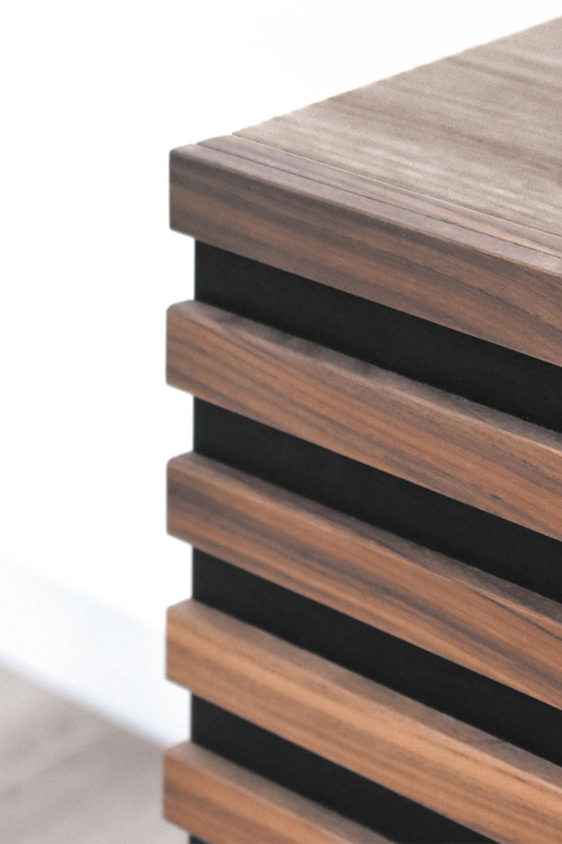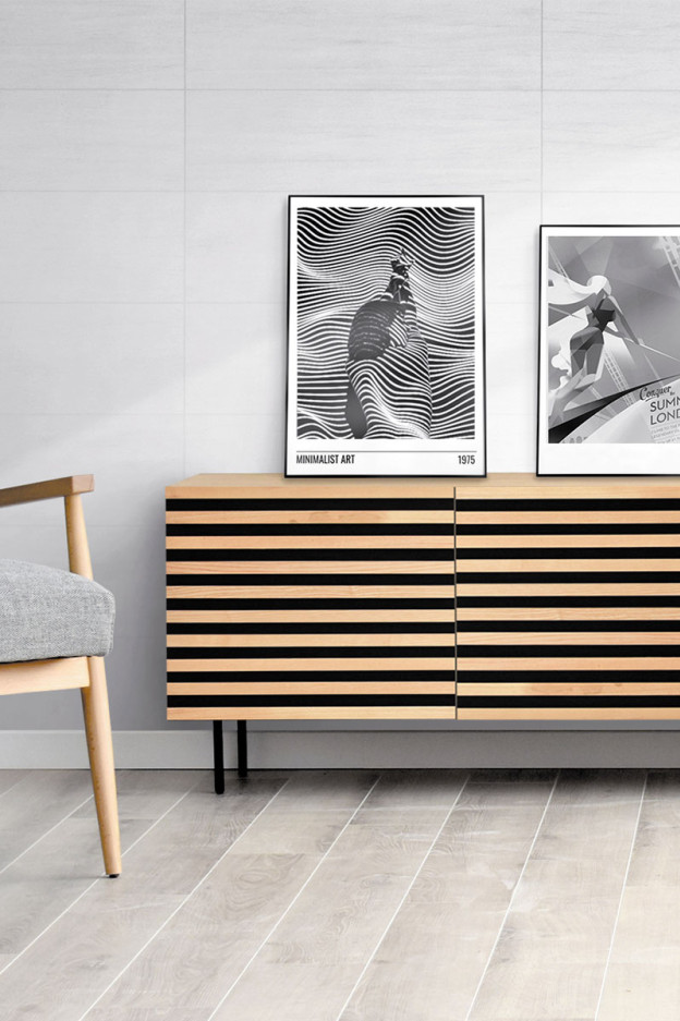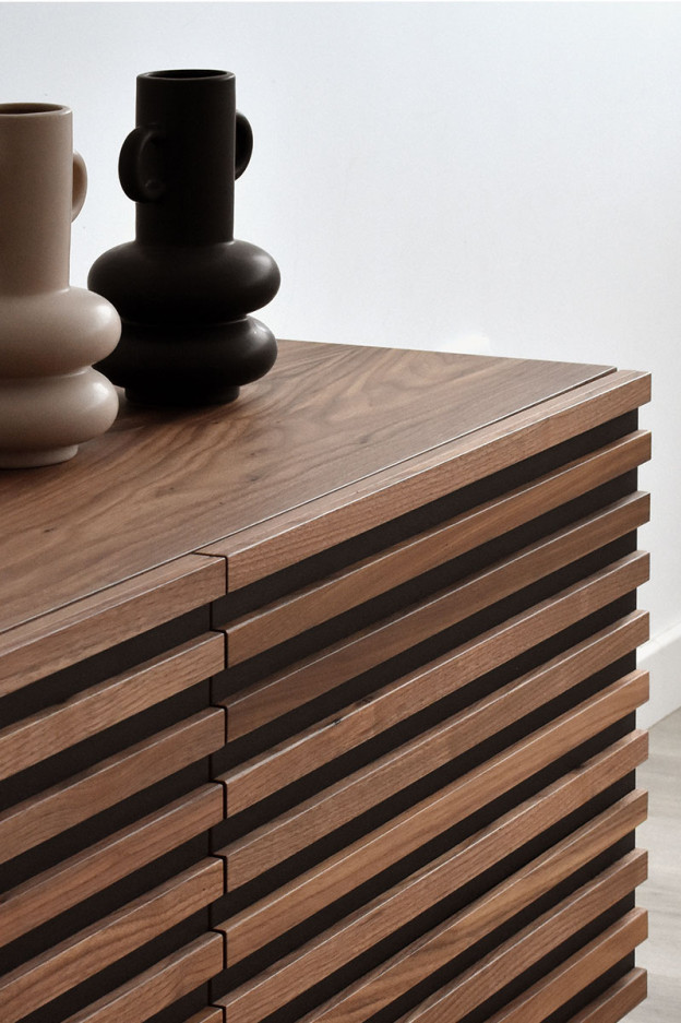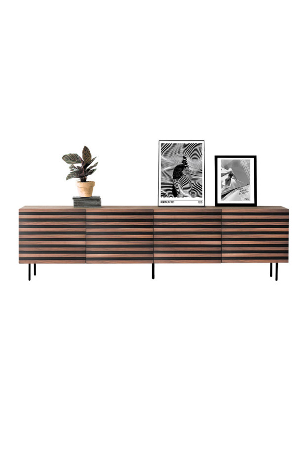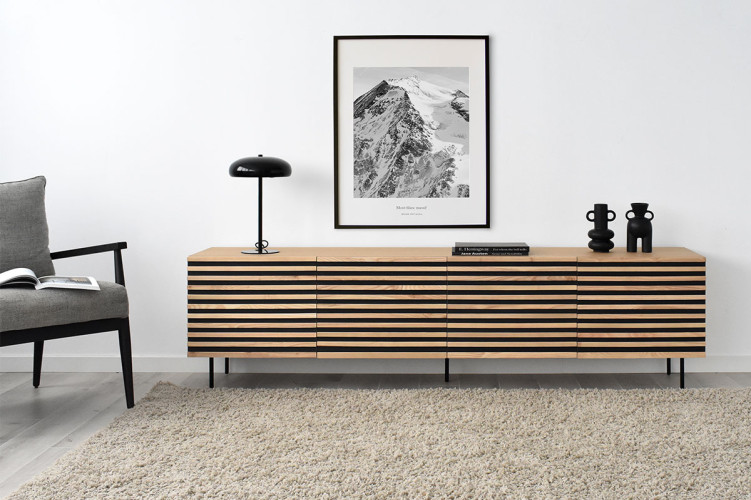 Nuestro mueble TV Einar tiene la estructura de fibra negra sobre madera y sus listones horizontales son de madera maciza.