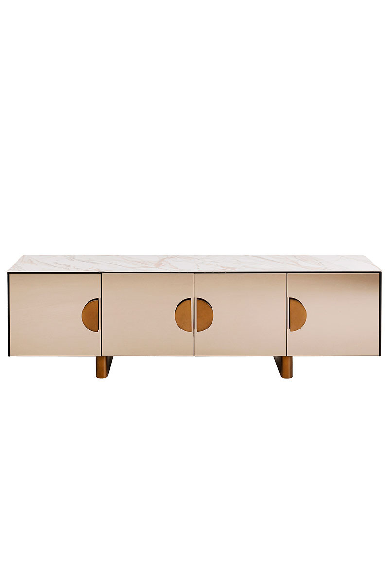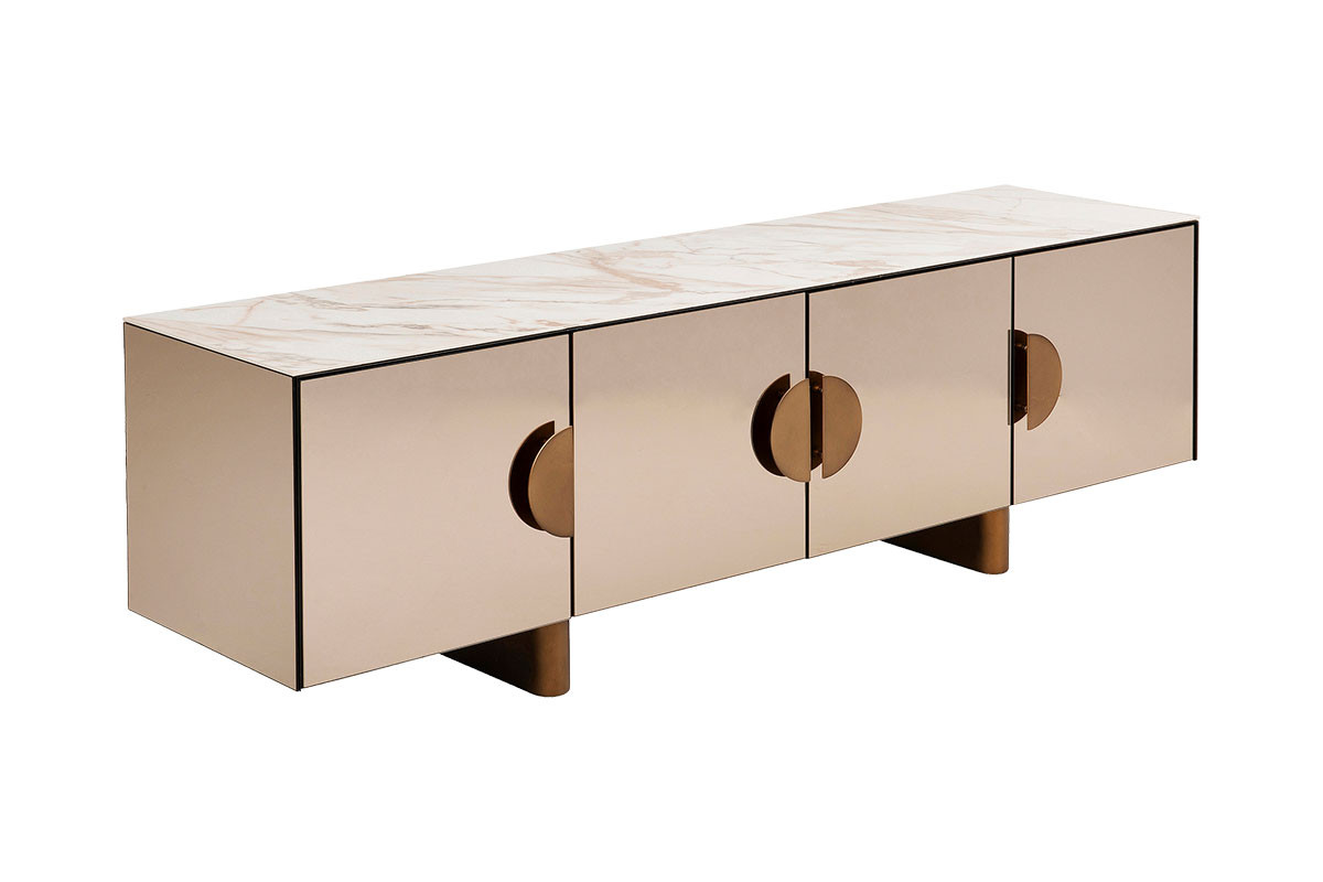 Fabricado en una estructura de acero que garantiza solidez y durabilidad, Lunar combina frentes en cristal de espejo tintado en tono beige, aportando profundidad y un sutil juego de reflejos.