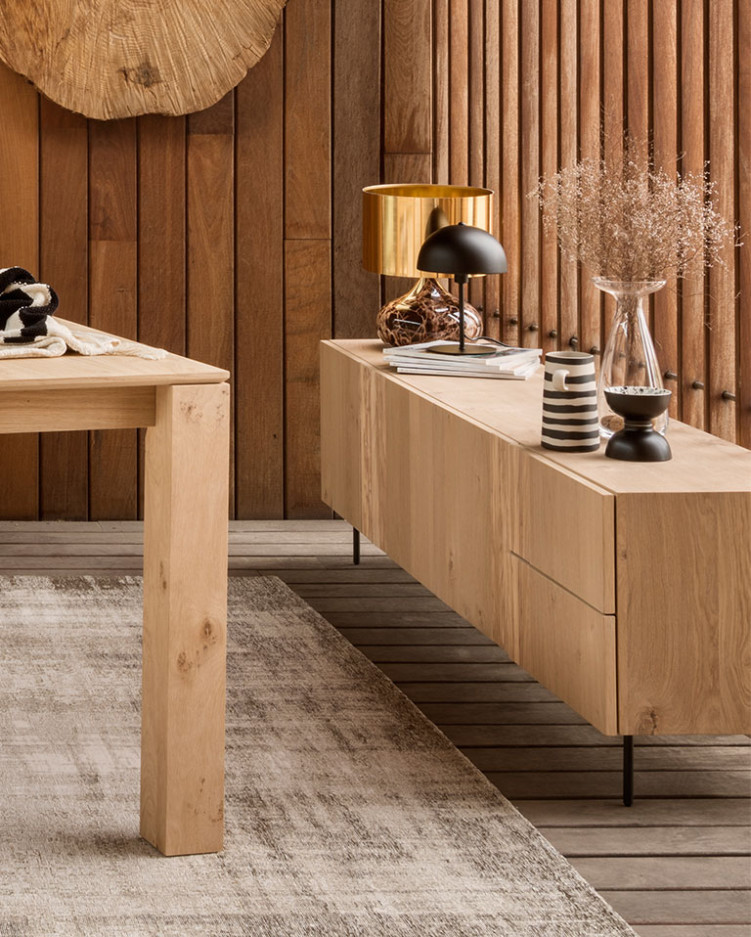 Estructura de madera chapada en acabado roble anudado o nogal. Con aceites y ceras ecológicos.