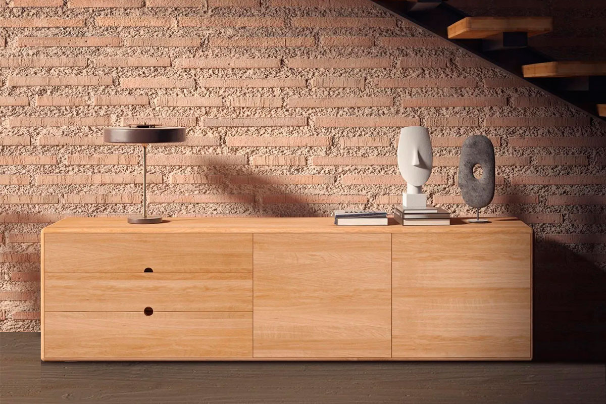 Nuestro mueble TV Perpetual tiene la estructura, las puertas y los cajones de madera maciza de roble europeo.