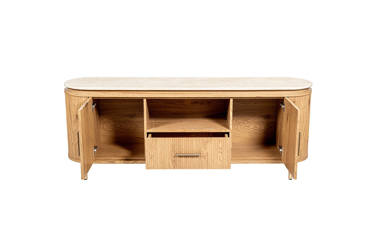 Está fabricado en madera y su tapa en un mármol artificial, aportando sofisticación y naturalidad a tu hogar.