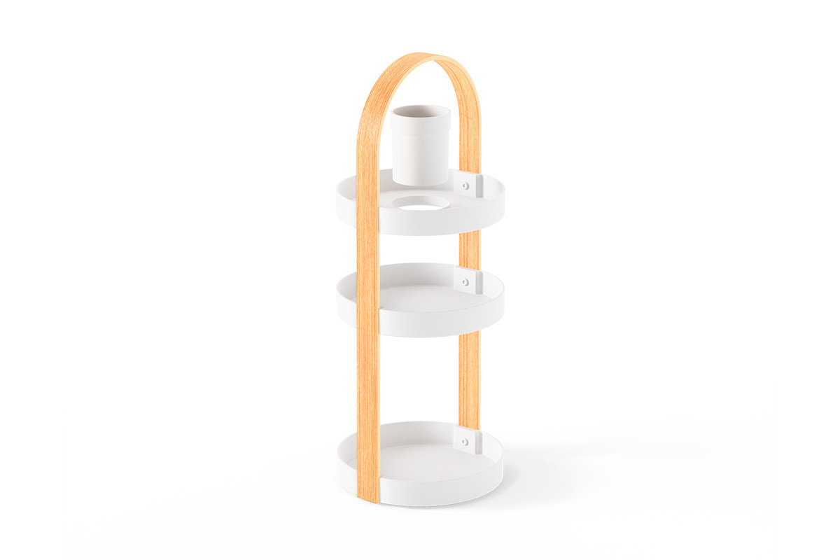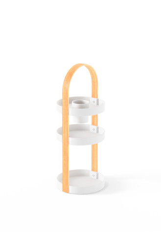 Este organizador de 3 bandejas tiene un diseño moderno y original que mantendrá todos tus productos organizados. Incluye un recipiente extraíble para guardar productos favoritos y un asa para poder moverlo con facilidad. Está fabricado con un 60% de plástico reciclado y madera renovable.