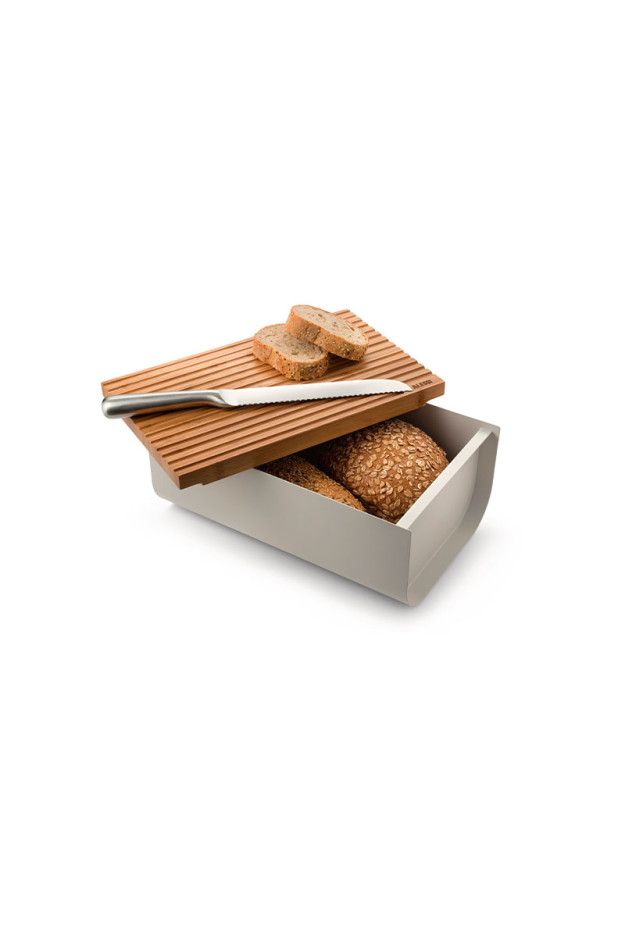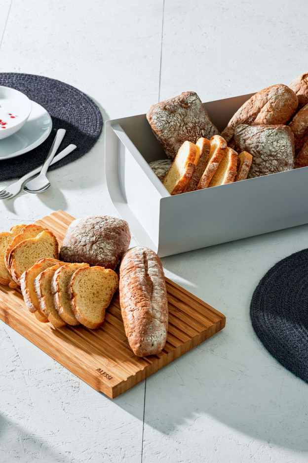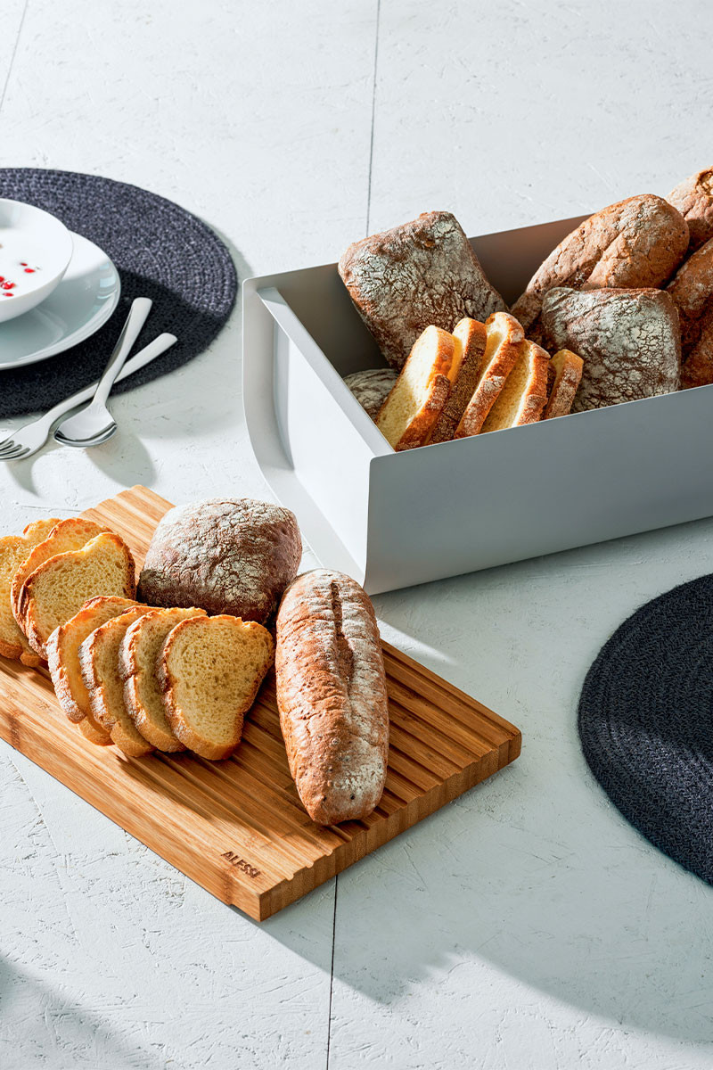 Mattina es una panera con un diseño lleno de funcionalidad, gracias a la práctica tapa que es ideal para utilizar como una tabla para cortar el pan, que conferirá un estilo contemporáneo a tus mesas.