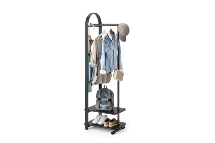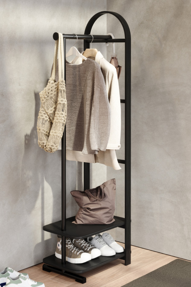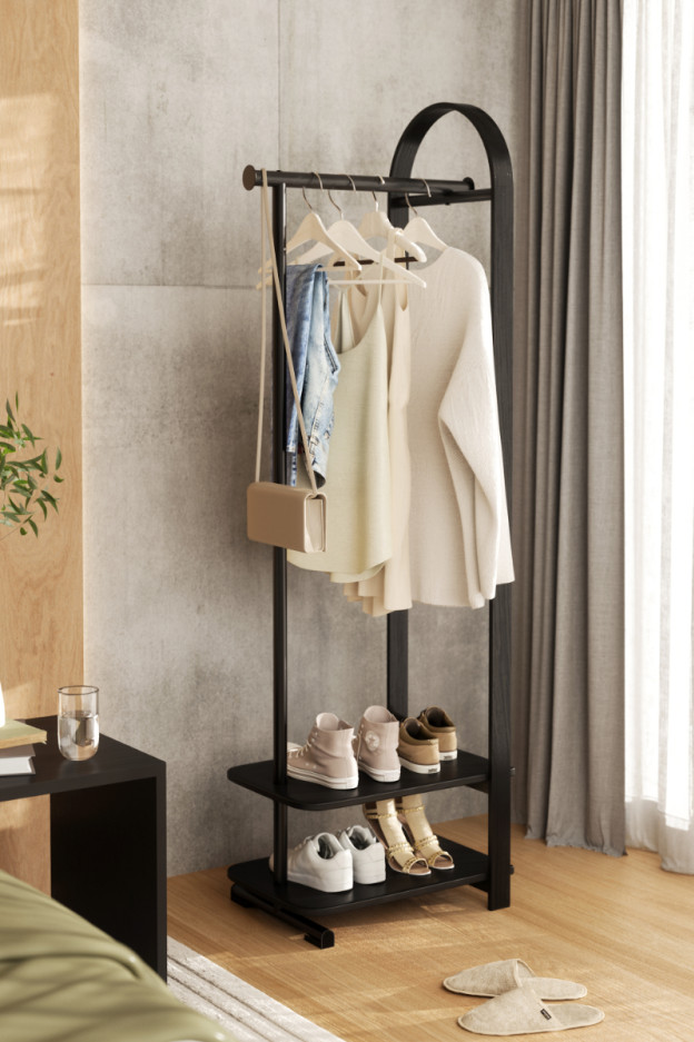 Belwood combina funcionalidad y versatilidad, puedes utilizar su barra para colgar abrigos, chaquetas, camisas… Dos prácticos estantes para colocar zapatos, cajas, bolsos… Y dos ganchos laterales para gorras, cinturones… Todo en un solo mueble.