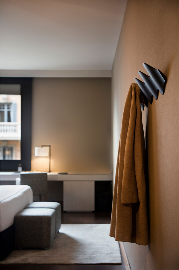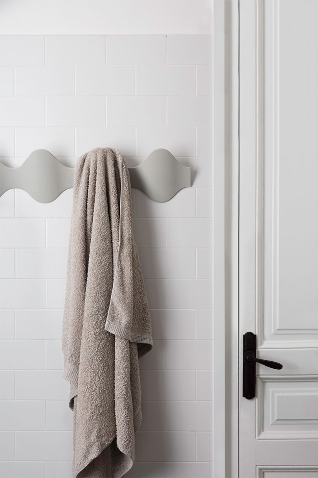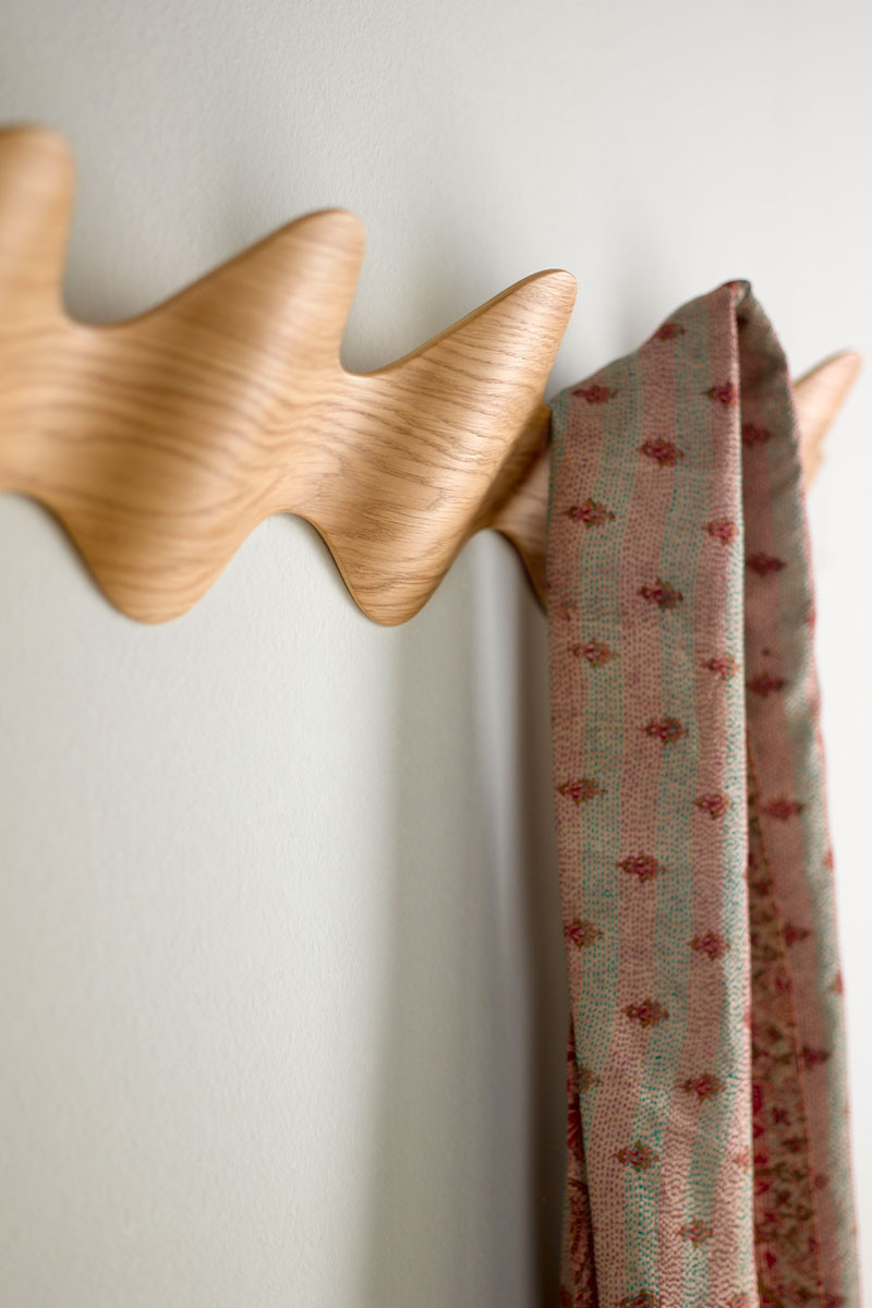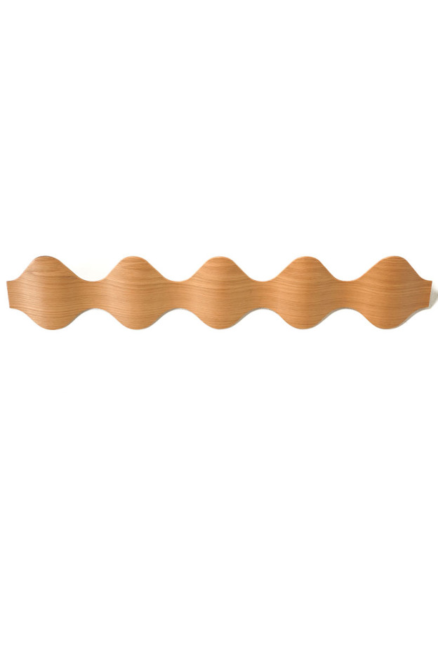 Perchero lineal de pared de madera o lacado, fruto de un juego formal entre la ondulación y el plano inclinado. Su valor ornamental, casi escultórico, el reconocimiento profesional y el éxito comercial, lo han convertido en un objeto emblemático del diseño español. Medidas: 97x19 cm. Diseño de Montse Padrós y Carlos Riart.