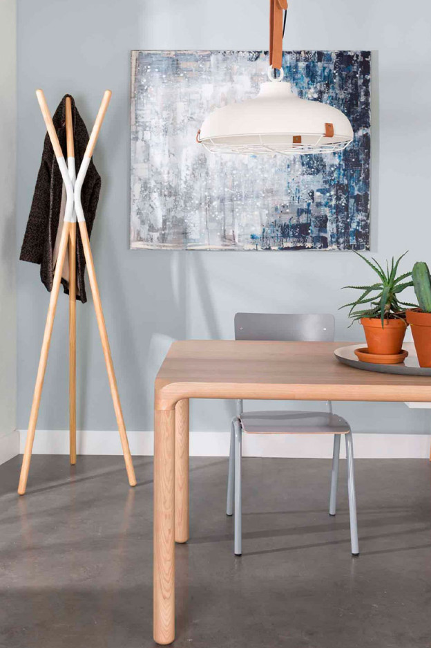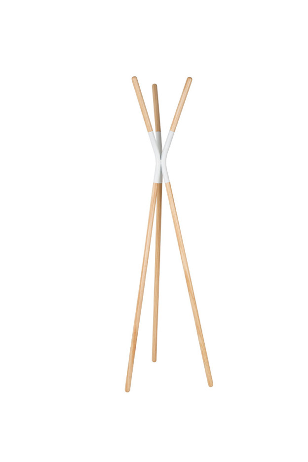 Perchero que recuerda al juego Mikado con un toque escandinavo. De madera de pino macizo natural lacada, y el detalle de acero, pintado en color blanco o gris oscuro.