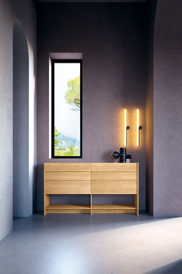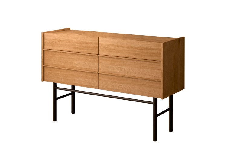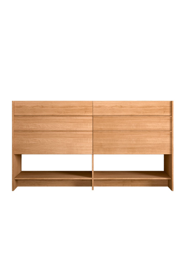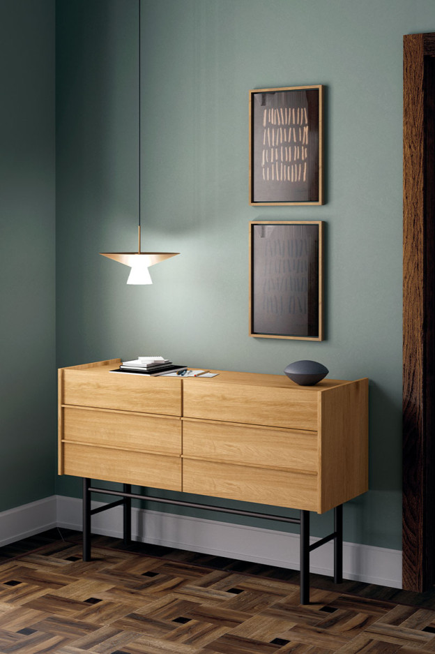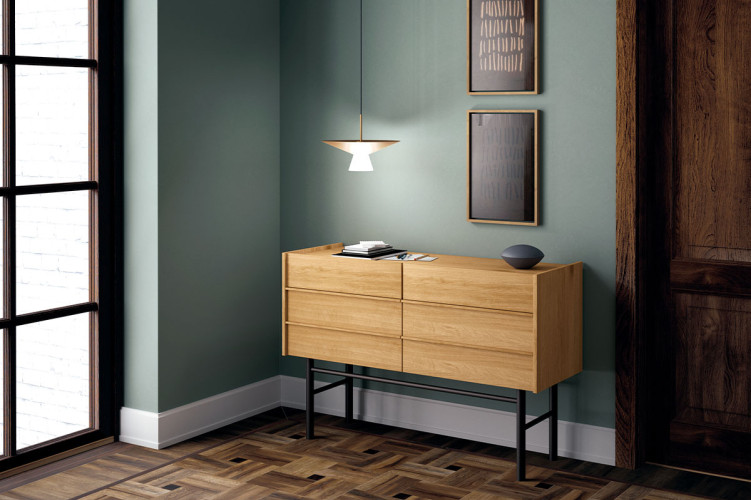 Fabricado de manera artesanal en madera maciza de roble alemán, a excepción del interior de sus cajones que están elaborados en chapa de roble.