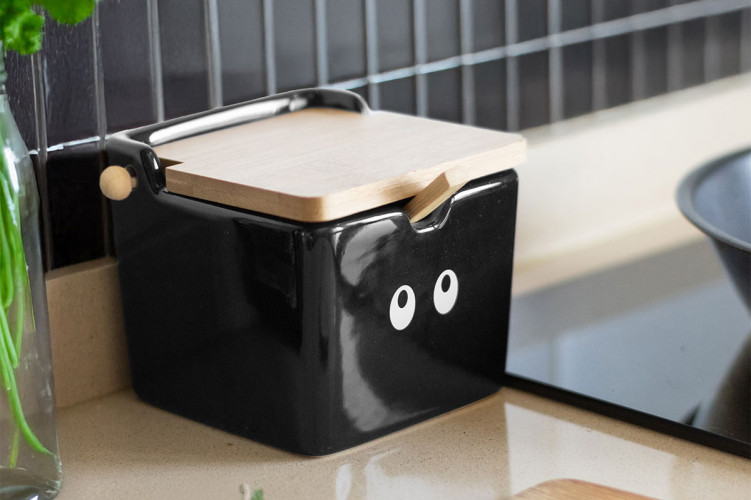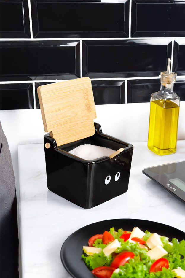 Dale un toque único y práctico a tu cocina con este salero de cerámica con un diseño original. Perfecto para guardar sal, azúcar o tu especia favorita, siempre a mano y en la cantidad justa. Su tapa de madera mantiene el contenido fresco y protegido de la humedad, mientras que la cuchara incluida te permite servir cómodamente sin ensuciarte las manos.