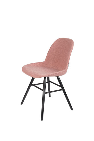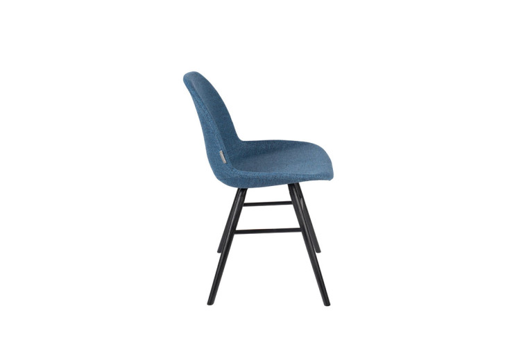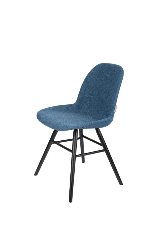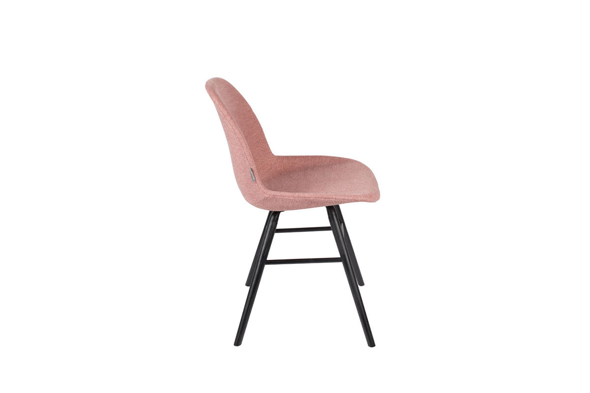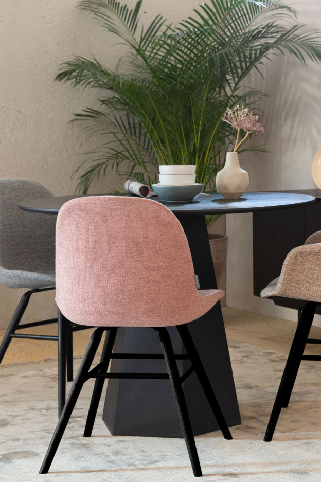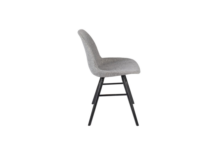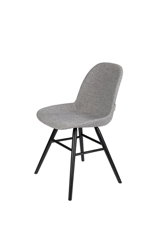 Silla con estructura de aluminio, patas de madera maciza de fresno lacadas en color negro. Asiento y respaldo tapizado con un cálido y cómodo tejido disponible en varios colores.