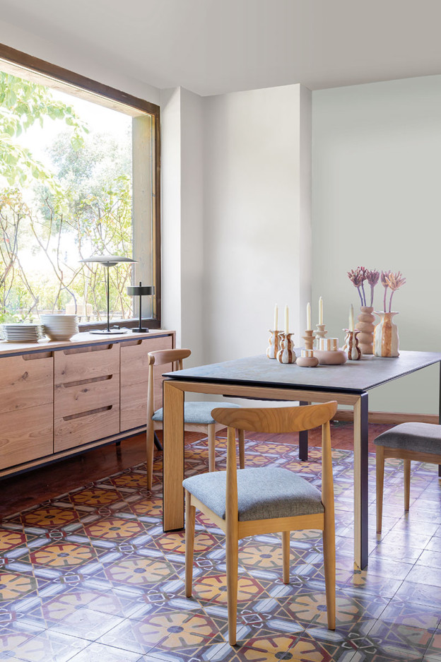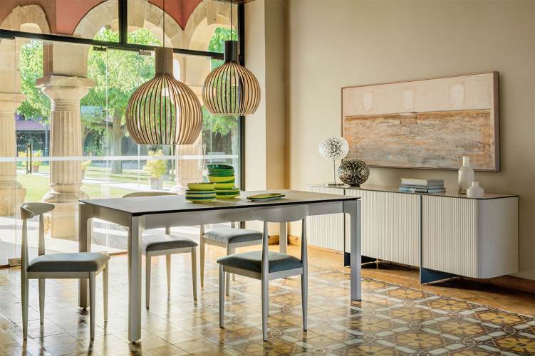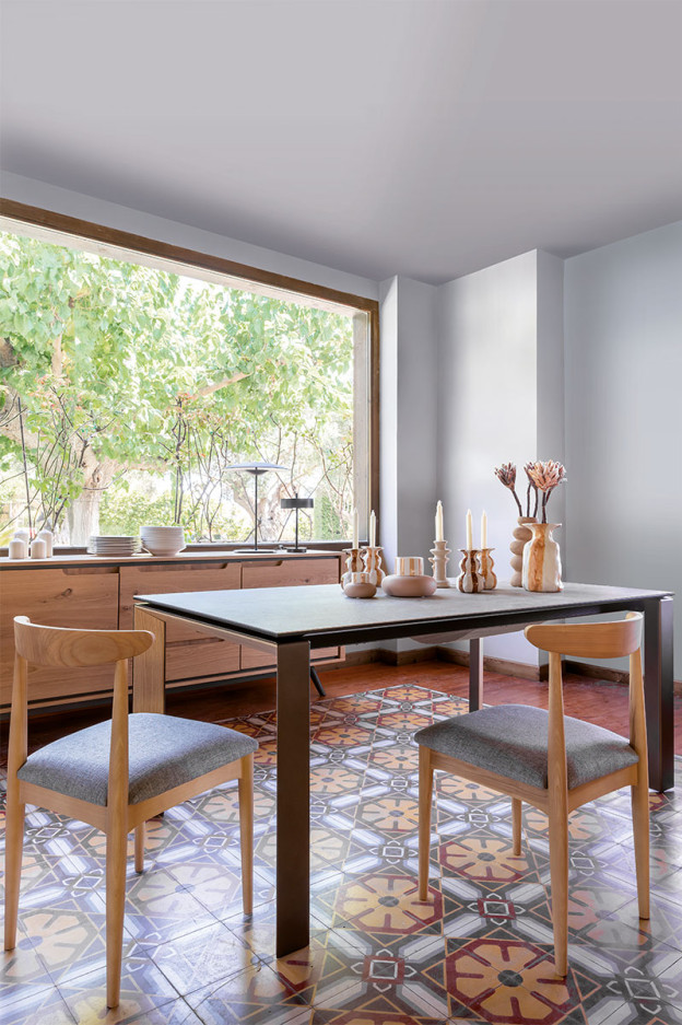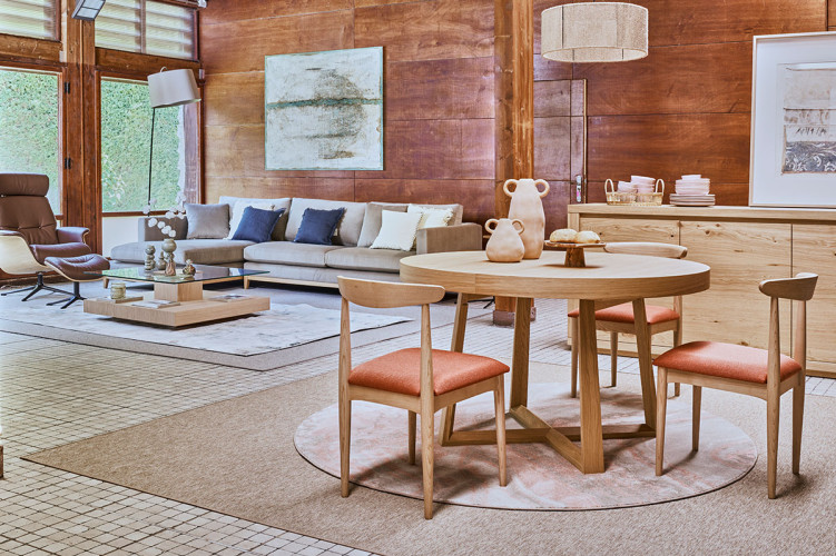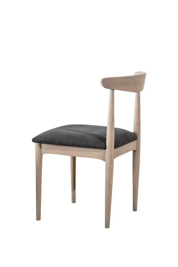 Estructura de madera maciza de haya en diferentes acabados. Asiento tapizado, disponible en varios colores.