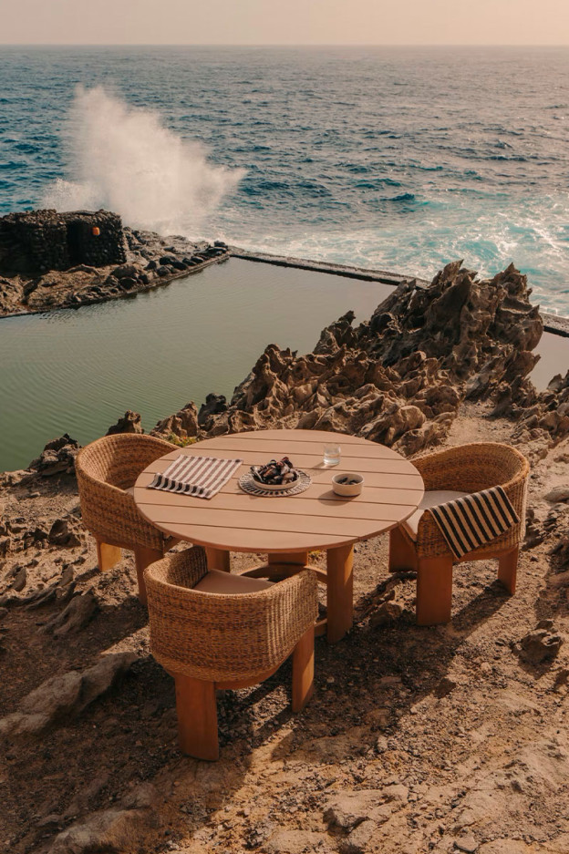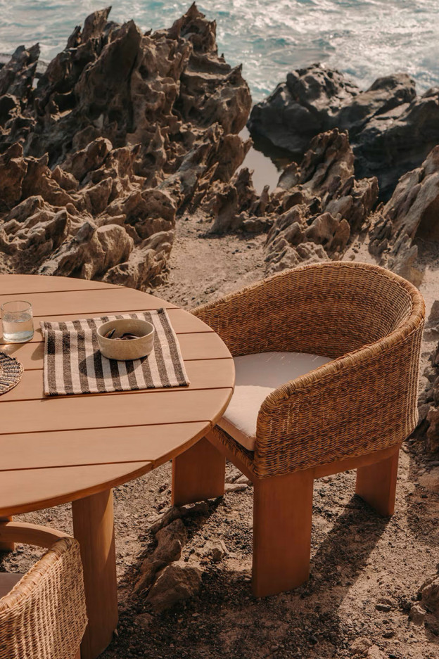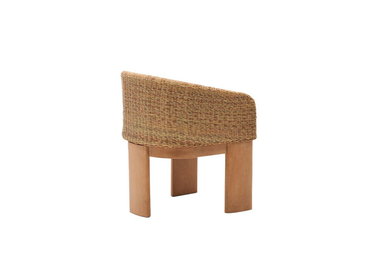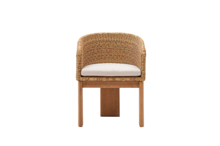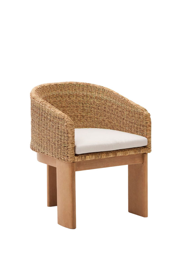 La estructura de la silla se encuentra fabricada en madera maciza de eucalipto, mientras que el asiento y el respaldo en ratán.