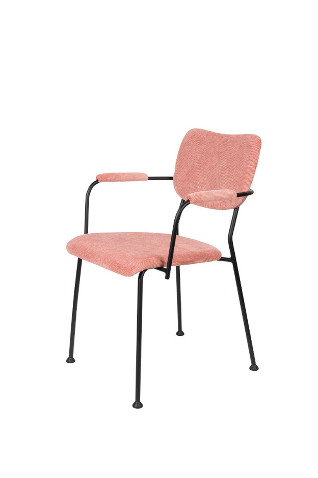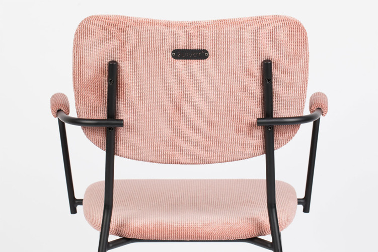 Silla con asiento y respaldo de madera contrachapada cubierta con espuma y tapizada en tela aspecto pana, disponible en varios colores. Estructura de acero con recubrimiento de polvo pintado en color negro.
