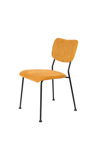 Silla con estructura de acero con recubrimiento de polvo negro, asiento y respaldo de madera contrachapada cubierta con espuma y tapizada en tejido con aspecto pana, disponible en varios colores.
