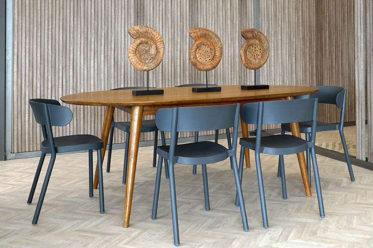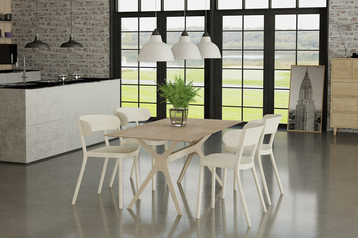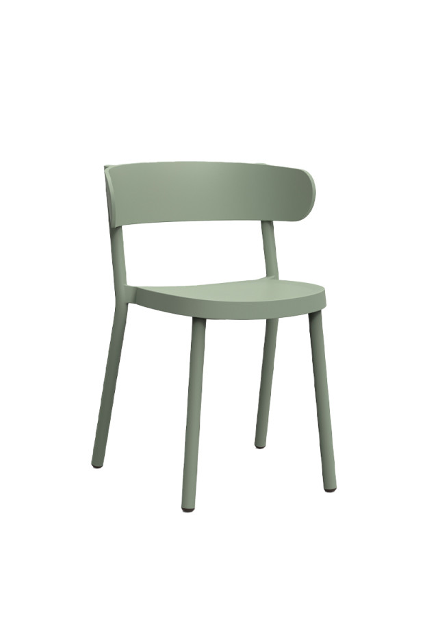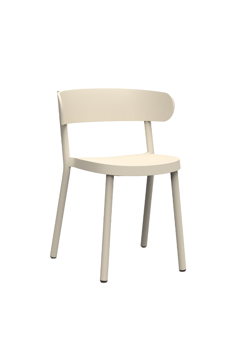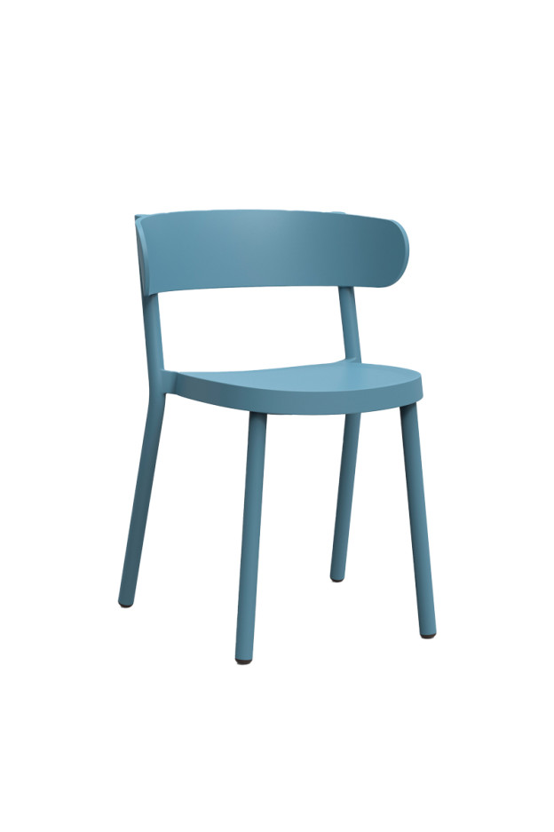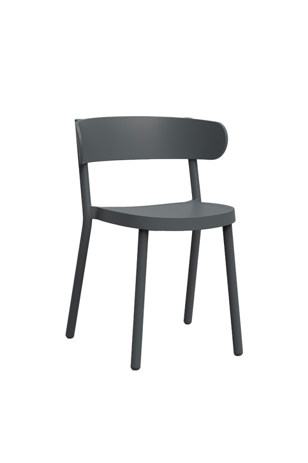 Sencilla, directa y a la vez elegante, esta silla busca ser eficaz, bien sea en su uso más común como en su aspecto más formal. Su fabricación se realiza por inyección en fibra de vidrio con polipropileno mediante tecnología de moldeo asistida por gas. Apilable, esta silla puede ser empleada para su uso tanto en interiores como en exteriores.