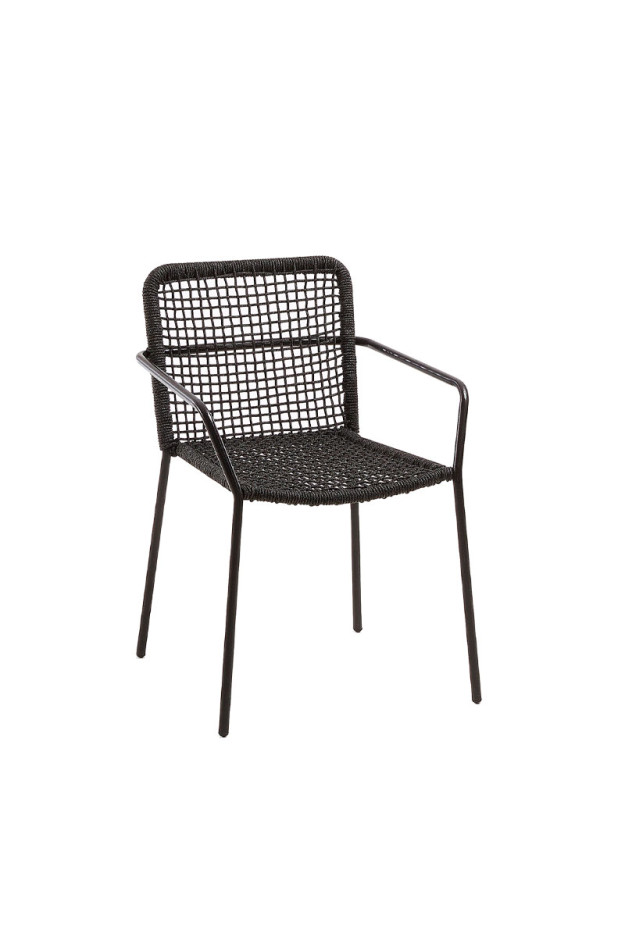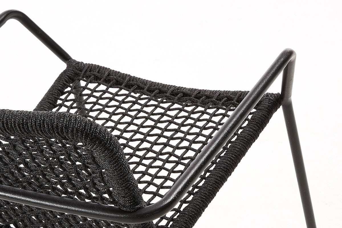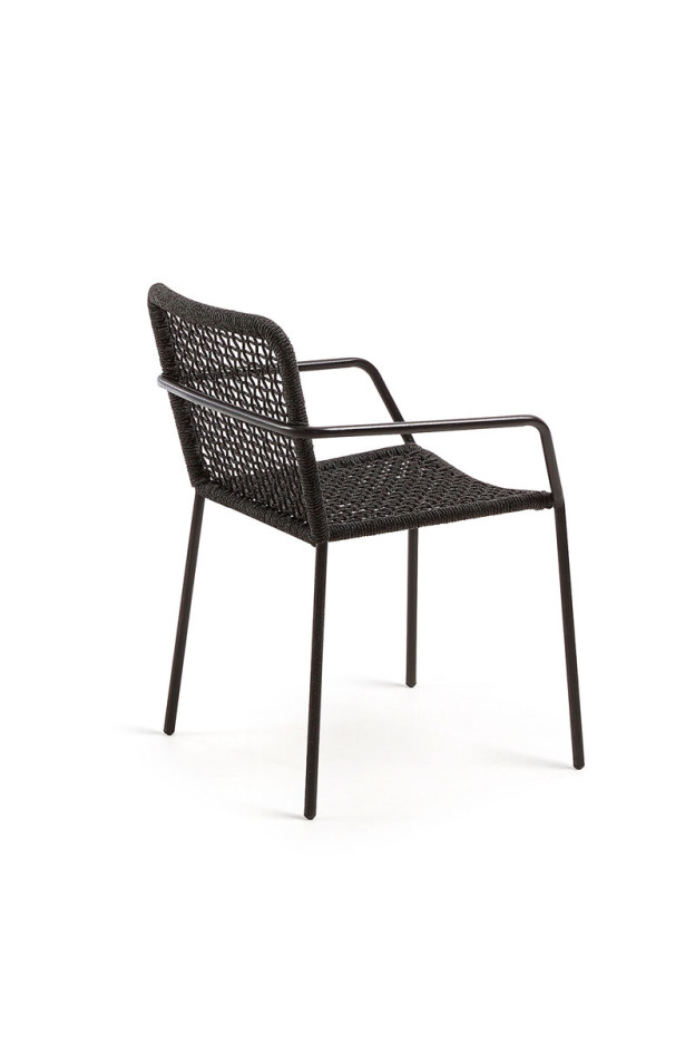 Nuestra silla de exterior Ela tiene la estructura de acero galvanizado en color negro y el asiento y el respaldo son de cuerda trenzada a mano.