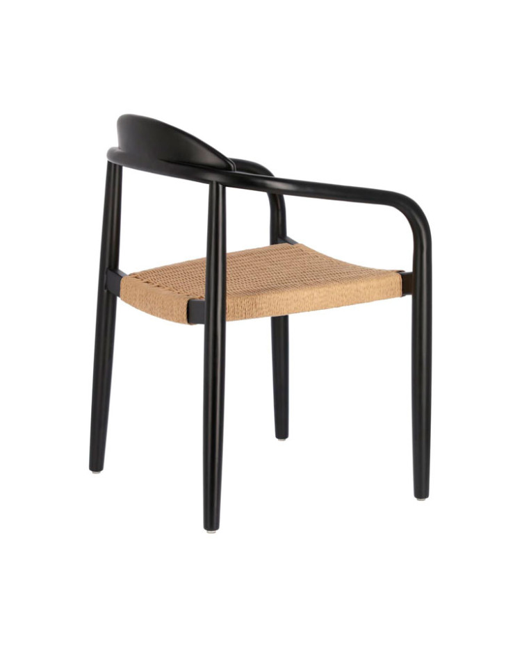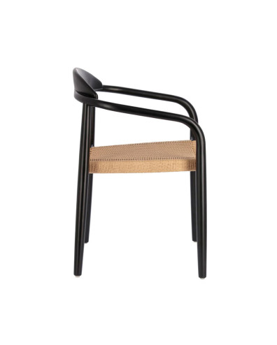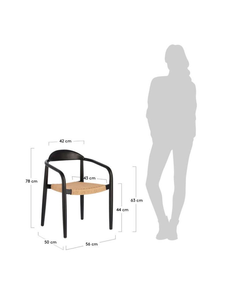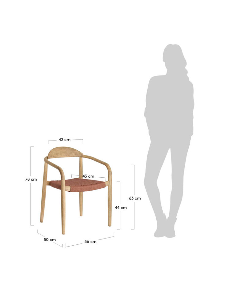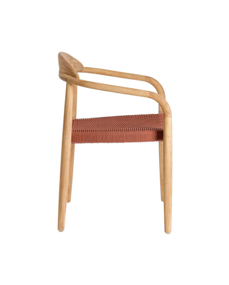 Silla de exterior con estructura de madera maciza de eucalipto. Asiento con cuerda trenzado a mano. Apilable. Apto para uso interior y exterior bajo techo.