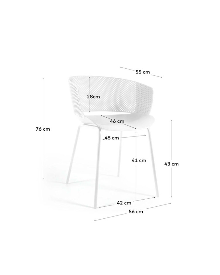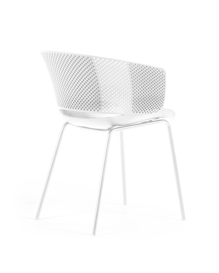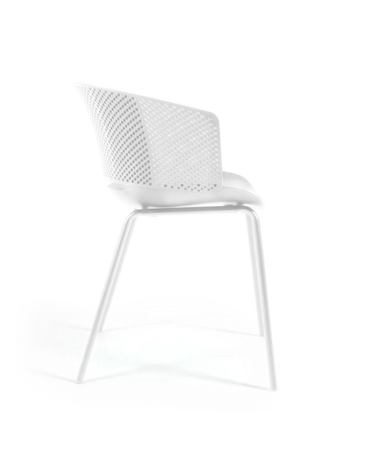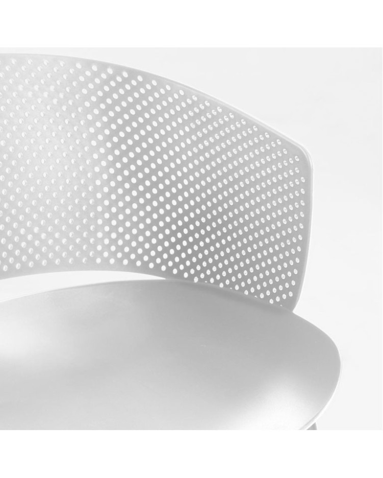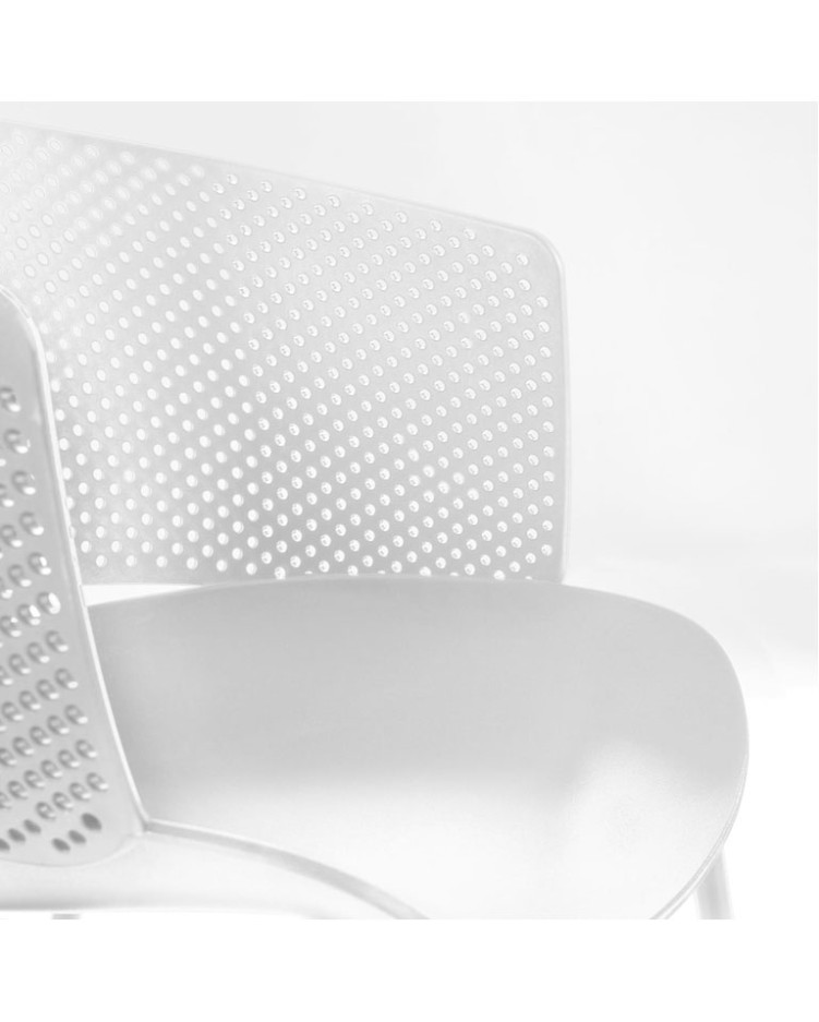 Yasir es una silla de exterior con las patas de acero aptas para exterior, el asiento y el respaldo es de polipropileno reciclado con tratamiento resistente a los rayos UV.