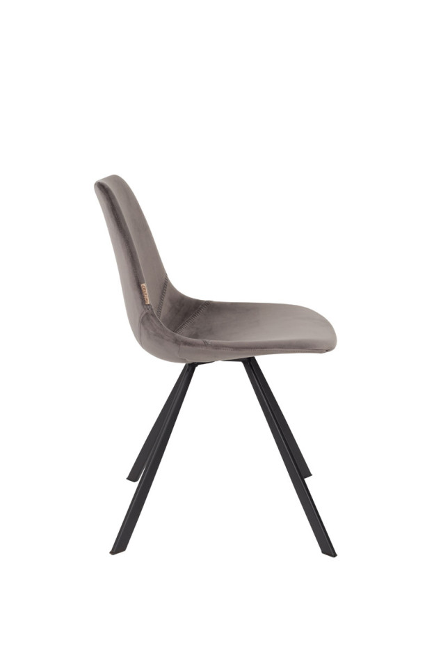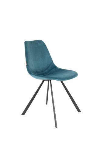 Silla con patas de acero en color negro. Asiento y respaldo de madera contrachapada recubieta de espuma y tapizada con un tejido suave de terciopelo. Disponible en varios colores.
