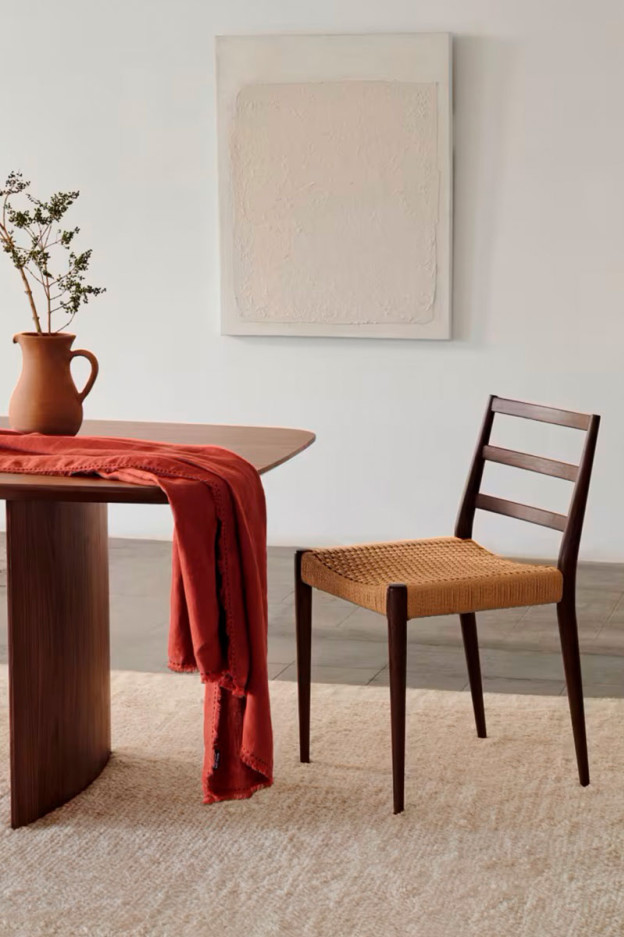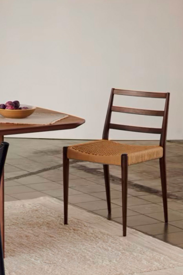 El asiento está trenzado a mano con cuerda de papel.