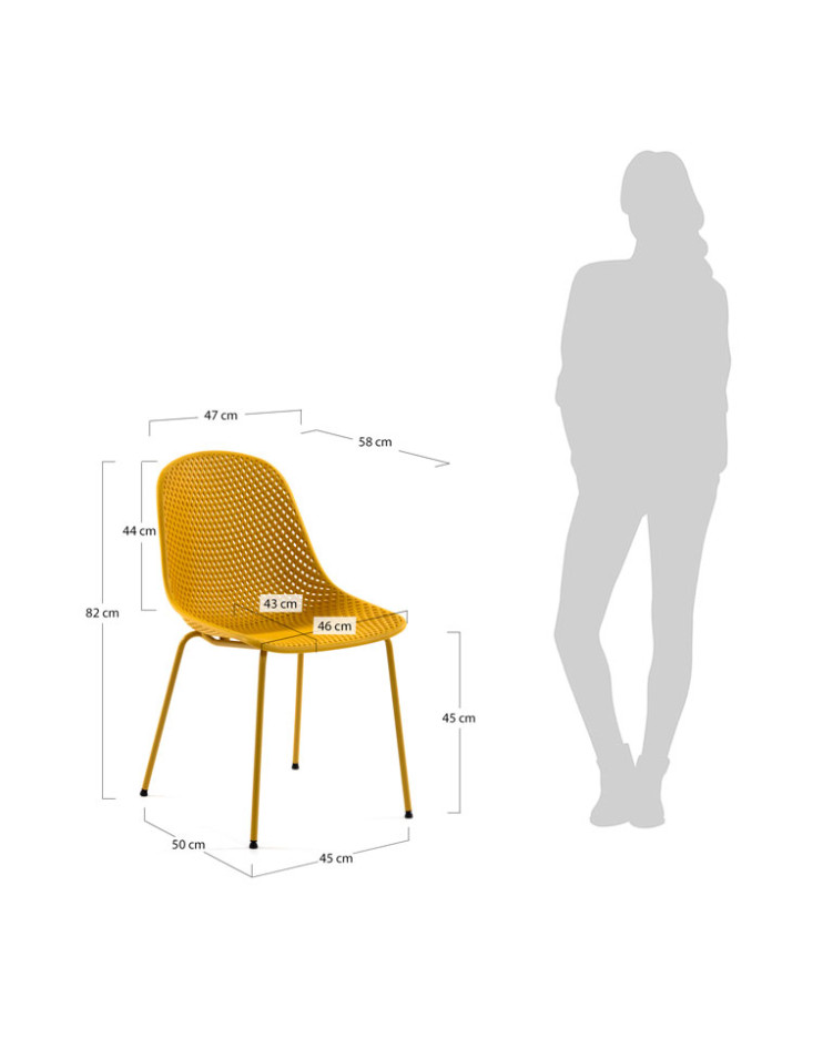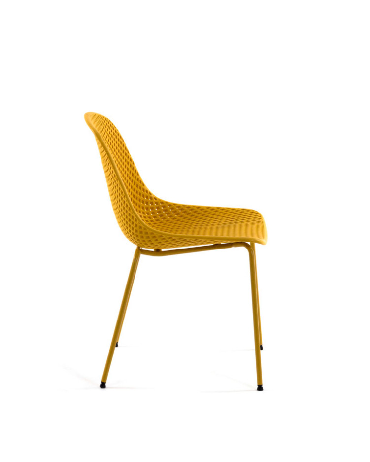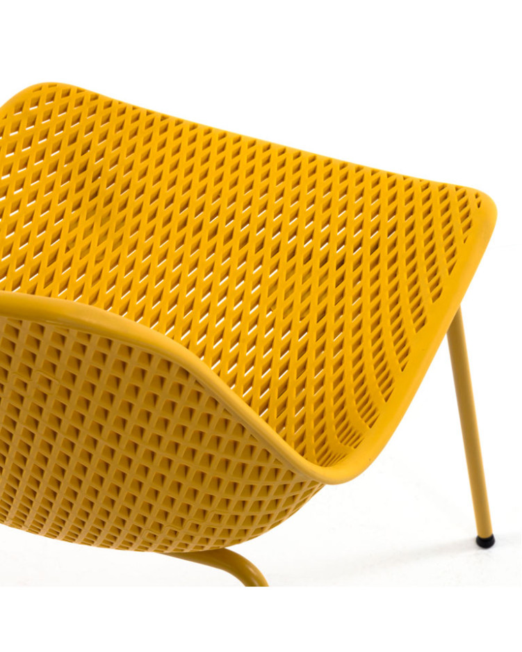Silla con estructura de acero pintado del mismo color que el asiento y el respaldo. Asiento y respaldo de polipropileno reciclado con rejilla.
