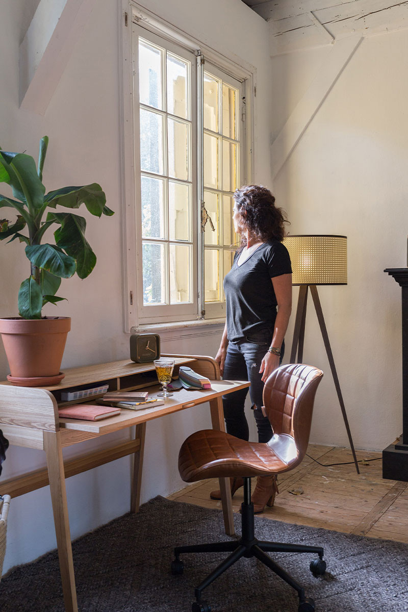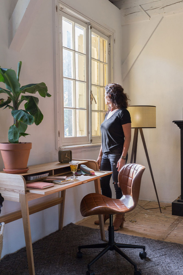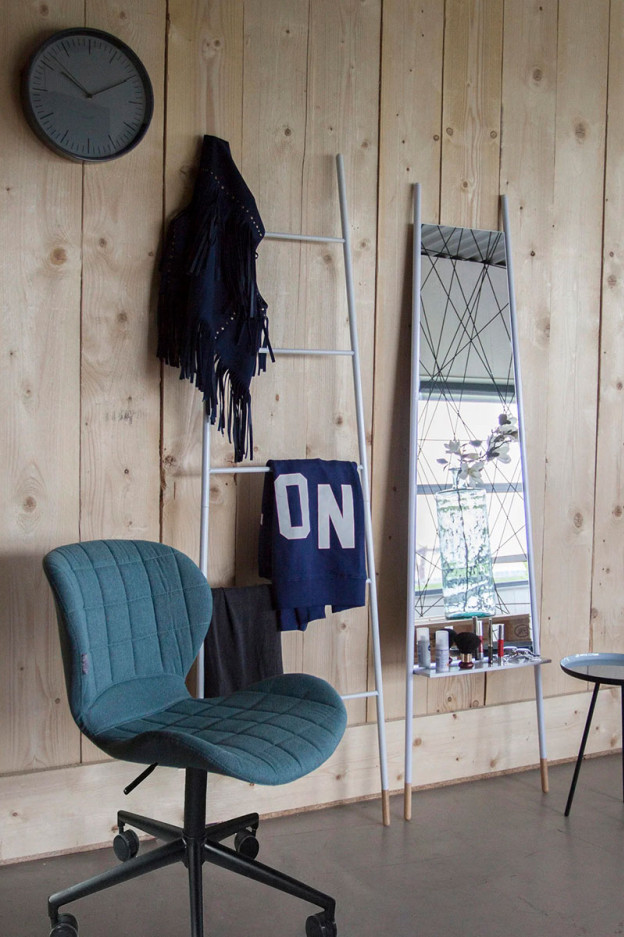 Asiento y respaldo de madera contrachapada con espuma de poliuretano. Patas de acero con revestimiento de polvo en color negro. Giratoria. Ajustable en altura.