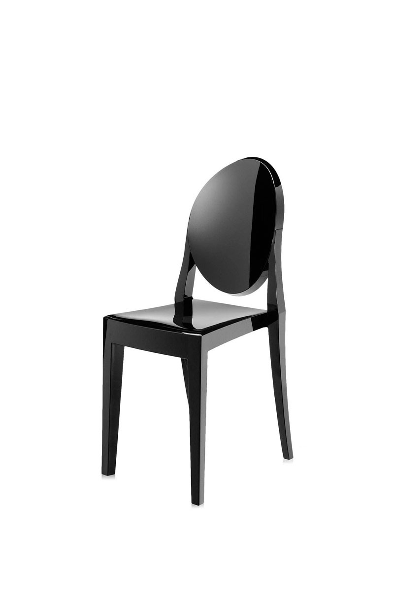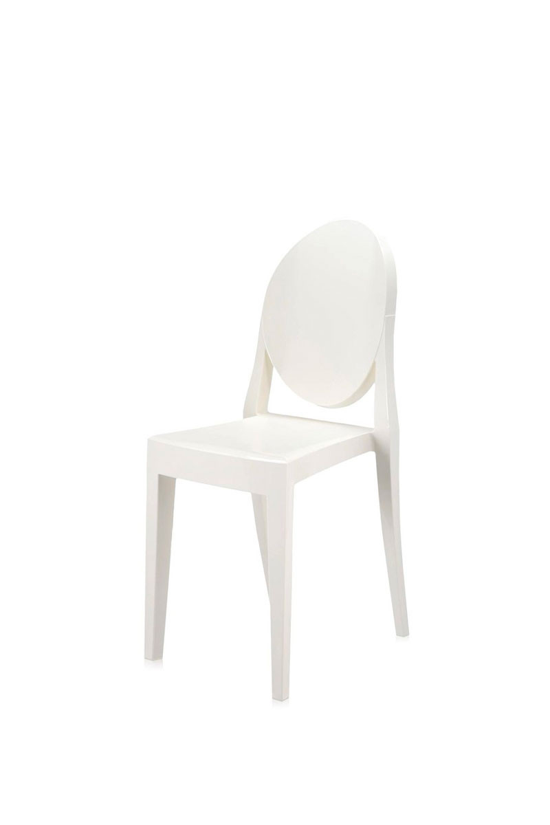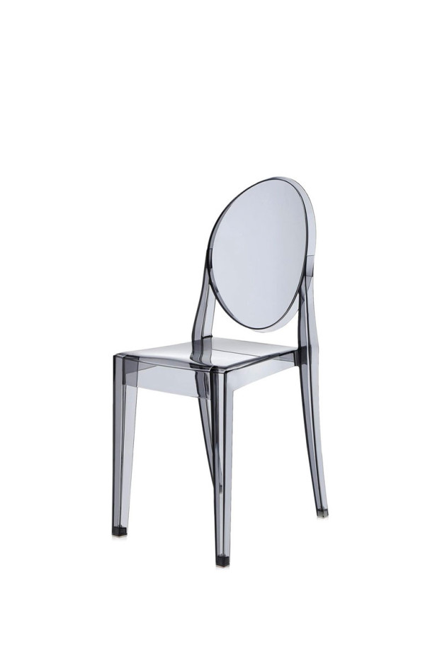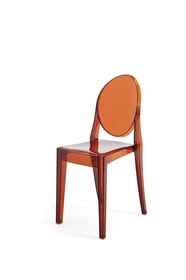 Una silla basada en una línea clásica, con el respaldo redondeado que recuerda la forma de los medallones antiguos, mientras que el asiento es linear y geométrico. Victoria Ghost está realizada en policarbonato transparente o de colores y es el resultado de la técnica de inyección en molde único. Es estable, cómoda, a prueba de golpes y resistente a los agentes atmosféricos. Una vez más, una silla realizada gracias a los conocimientos técnicos que Kartell ha acumulado con el paso de los años realizando objetos que la hacen reconocible en todo el mundo. Un producto de gran carisma y personalidad que se impone con elegancia en cualquier tipo de ambiente. Medidas: 38x52x89 cm. Diseño de Philippe Starck.