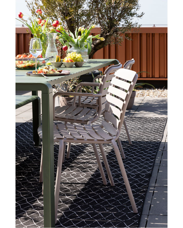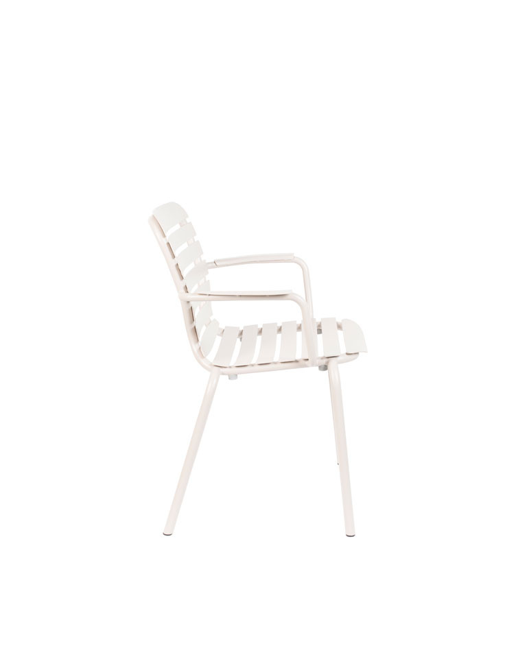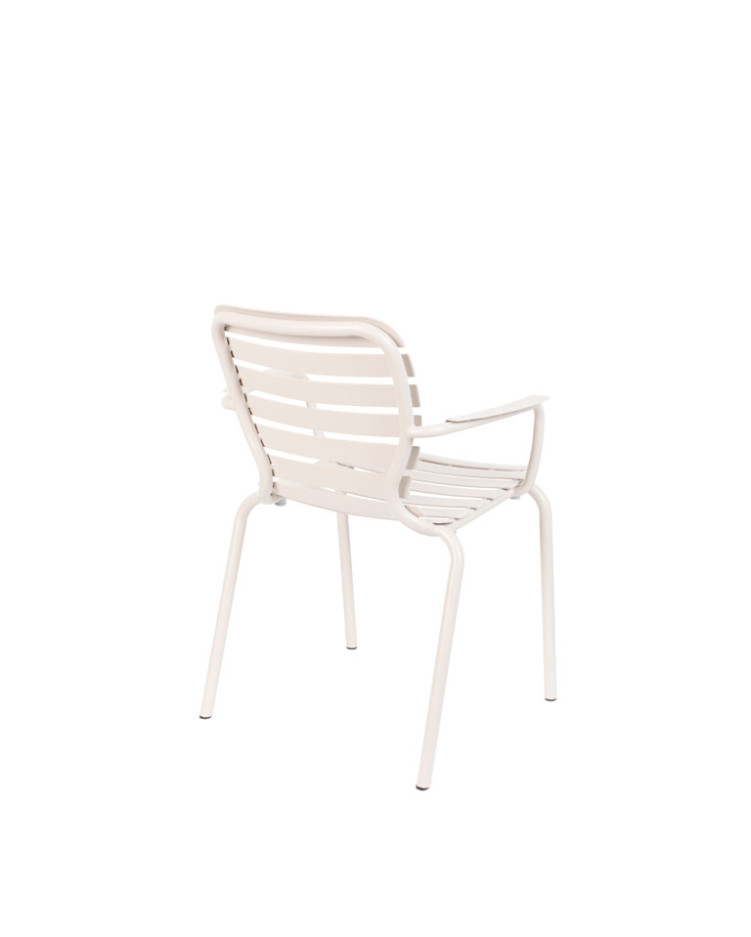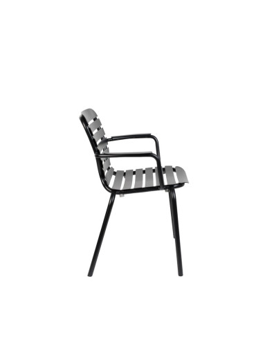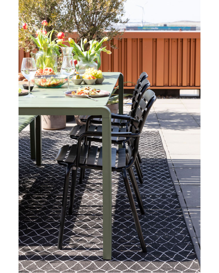 Silla Vondel con brazos. Asiento, respaldo y estructura de aluminio pintado en polvo y disponible en tres colores, verde, negro y arcilla. Altamente resistente para uso exterior.