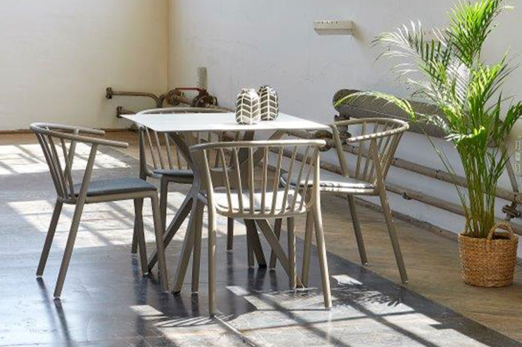 Esta silla ha sido desarrollada pensando en sus múltiples usos en los diferentes ambientes, tanto exteriores como interiores. La comodidad que le da su tapizado no es ningún impedimento para su convivencia sea cual sea su ubicación pues está fabricada con Composición Sunbrella®. Con espuma de secado rápido.