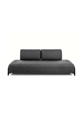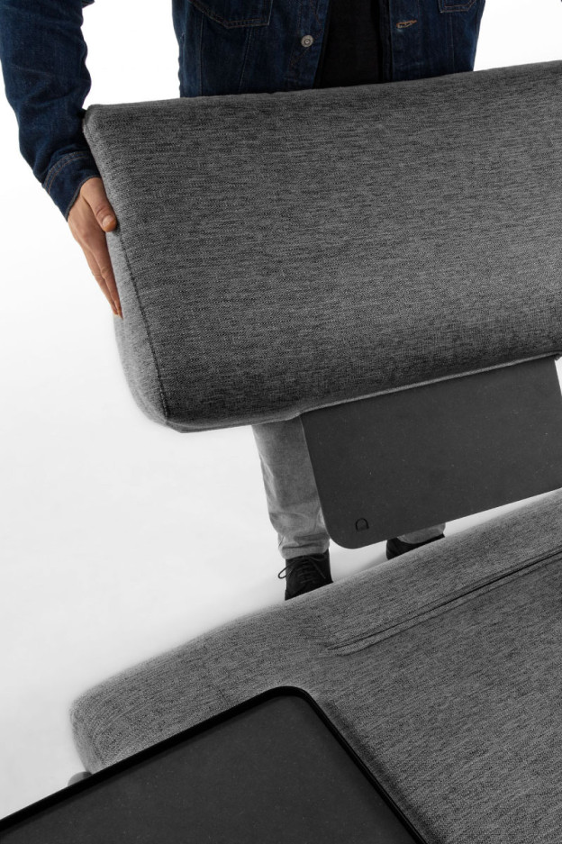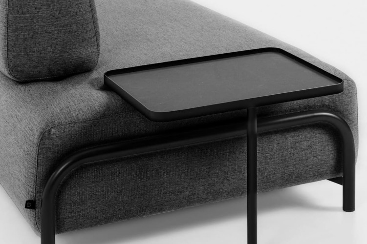 Estructura de madera rellena de espuma. Patas de metal en color negro. Posibilidad de añadir brazos y dos tamaños de bandejas. Tapizado en tela en diferentes colores.