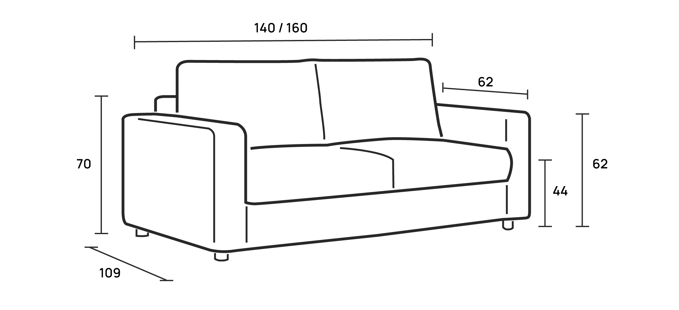 El sofá está disponible en medidas diferentes, cama 140x195 cm, cama 160x195 cm.