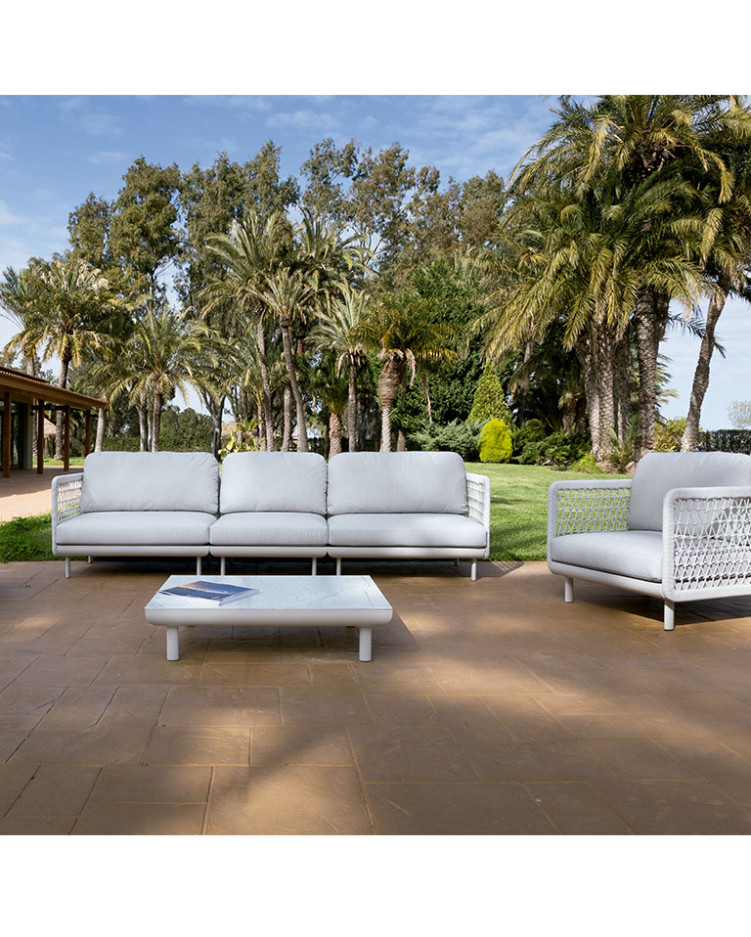 Nuestra sofá Isquia es una sofá para exterior muy cómodo que puede combinar con la butaca, el puf, la mesa de centro y auxiliar Isquia para formar conjuntos con mucha personalidad.