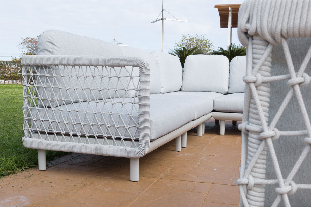 Nuestro sofá de exterior Isquia tiene la estructura de aluminio en color gris claro, el respaldo y los brazos son de cuerda trenzada de poliéster envuelta de PVC, una cuerda altamente resistente. Los cojines de asiento y de respaldo están tapizado en tejido acrílico impermeable resistente a los rayos UV en color gris.