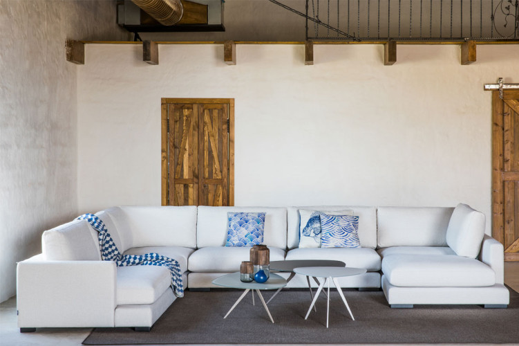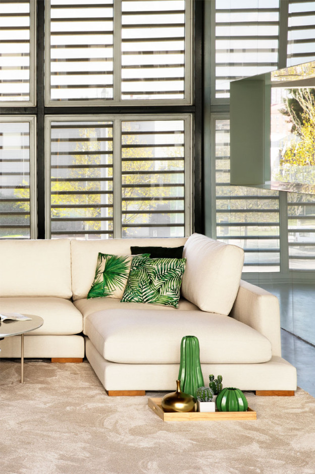 Se trata de un sofá, que puede adquirirse como sofá esquinero. Posee un gran fondo, patas de madera y una alta capacidad de recuperación a su estado original; viene acompañado de cojines y respaldo de fibra siliconada, lo que además de resistentes les hace cómodos. Cojines decorativos no incluidos.