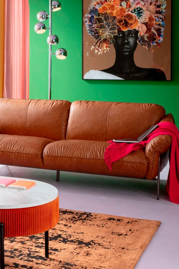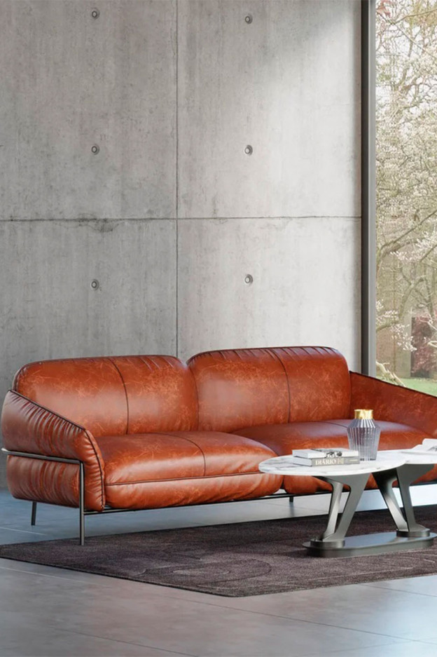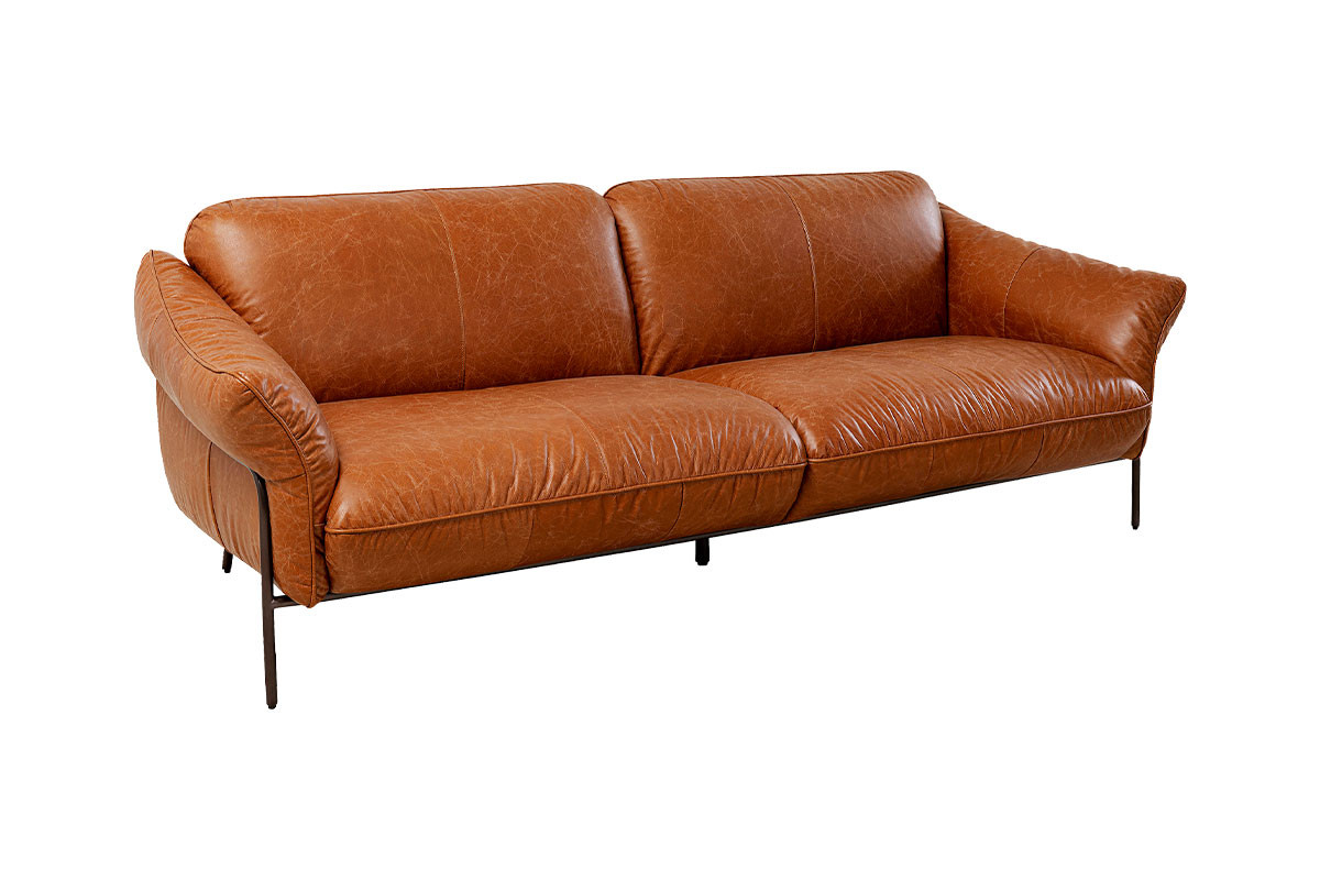 Su tapizado en piel semianilina de tono marrón cálido aporta una elegancia natural que transforma cualquier salón en un espacio de distinción.