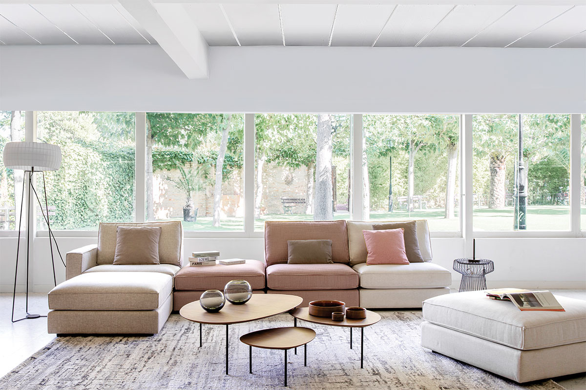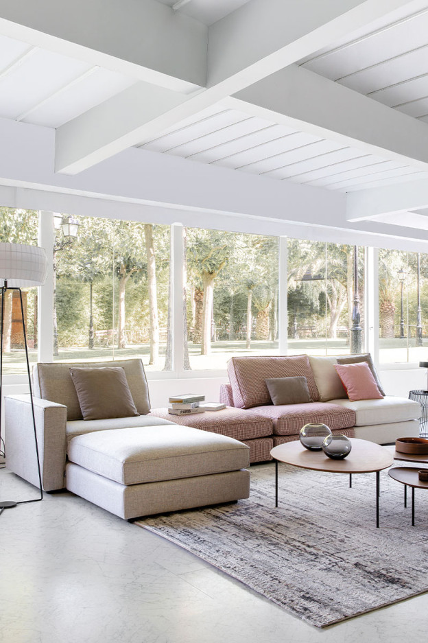 Sofá completamente modular fabricado con una base de madera maciza recubierta de espuma de alta densidad. Los cojines del asiento y del respaldo cuentan con un relleno de espuma combinado con viscoelástica.