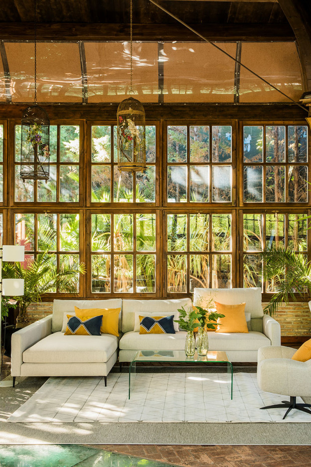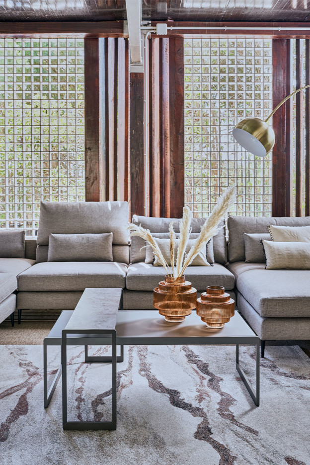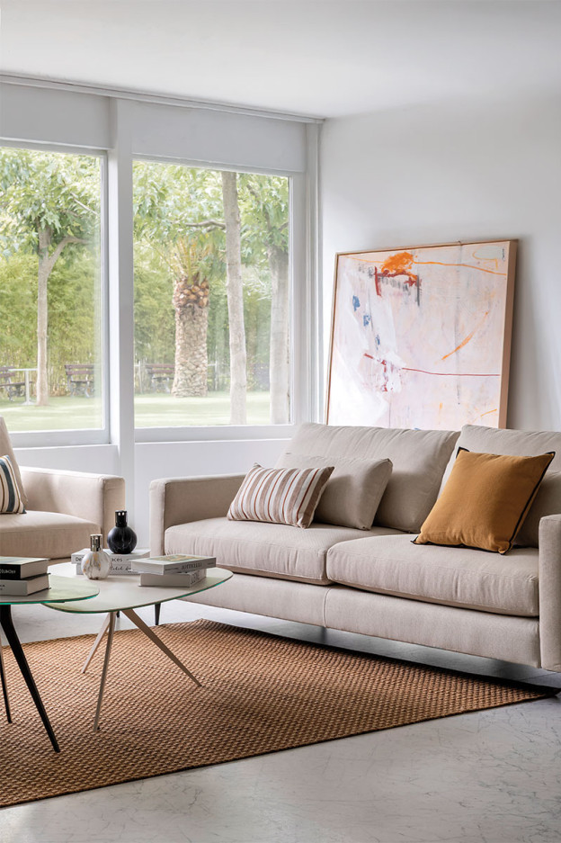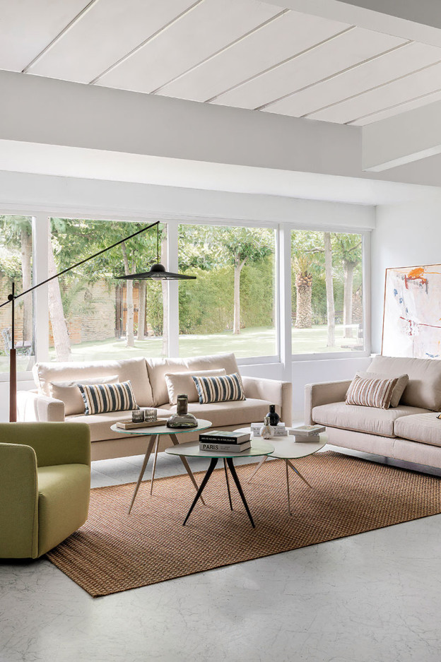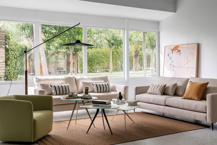 Estructura de madera maciza. Cojines de asiento rellenos de espuma. Cojines de respaldo rellenos de fibra hueca y conforel. Patas cromadas. Modular. Cojines desenfundables. Posibilidad de colocar el cojín del respaldo alto o bajo.