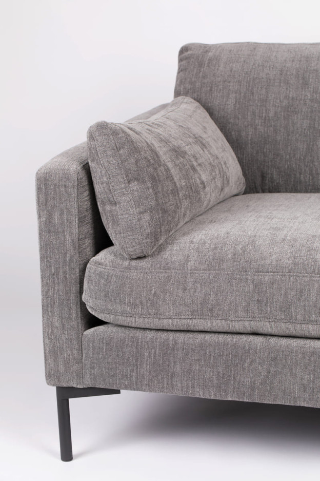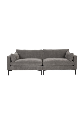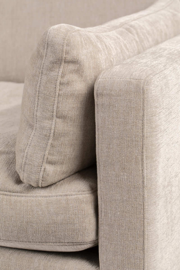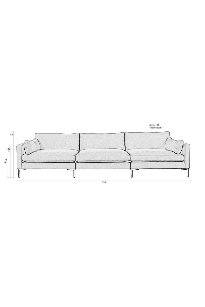Sofá con estructura de madera mixta recubierta de espuma de alta densidad y elasticidad. Cojines de asiento y respaldo rellenos de plumas y fibra hueca siliconada. Patas de acero. Disponible en tres o cuatro plazas y en dos colores distintos.