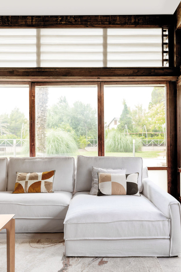 El color del sofá es un color blanco tapizado en tela antimanchas, con lino y viscosa.