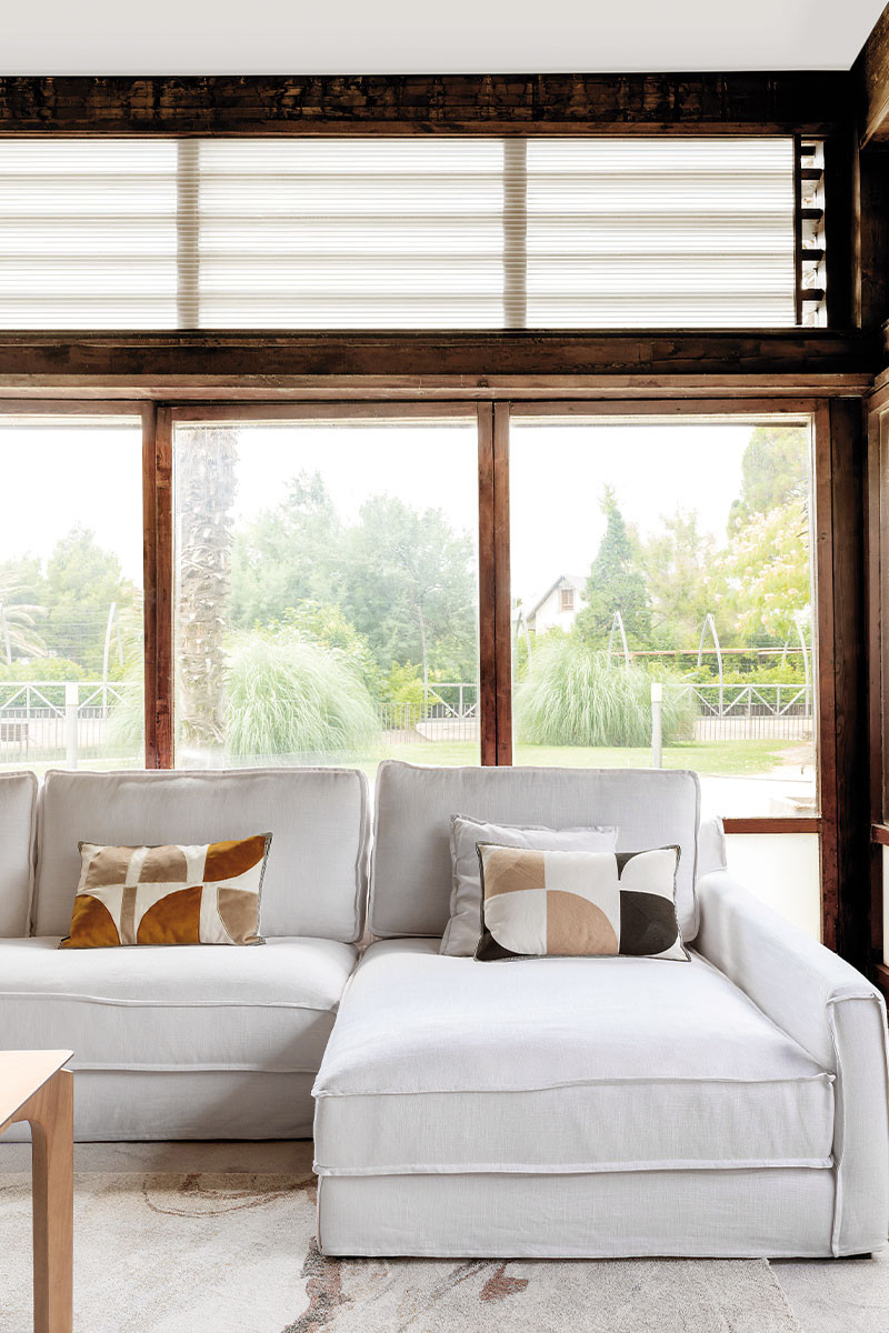 La estructura del sofá está fabricada en madera maciza cubierta de espuma de densidad alta. Las patas son de metal.