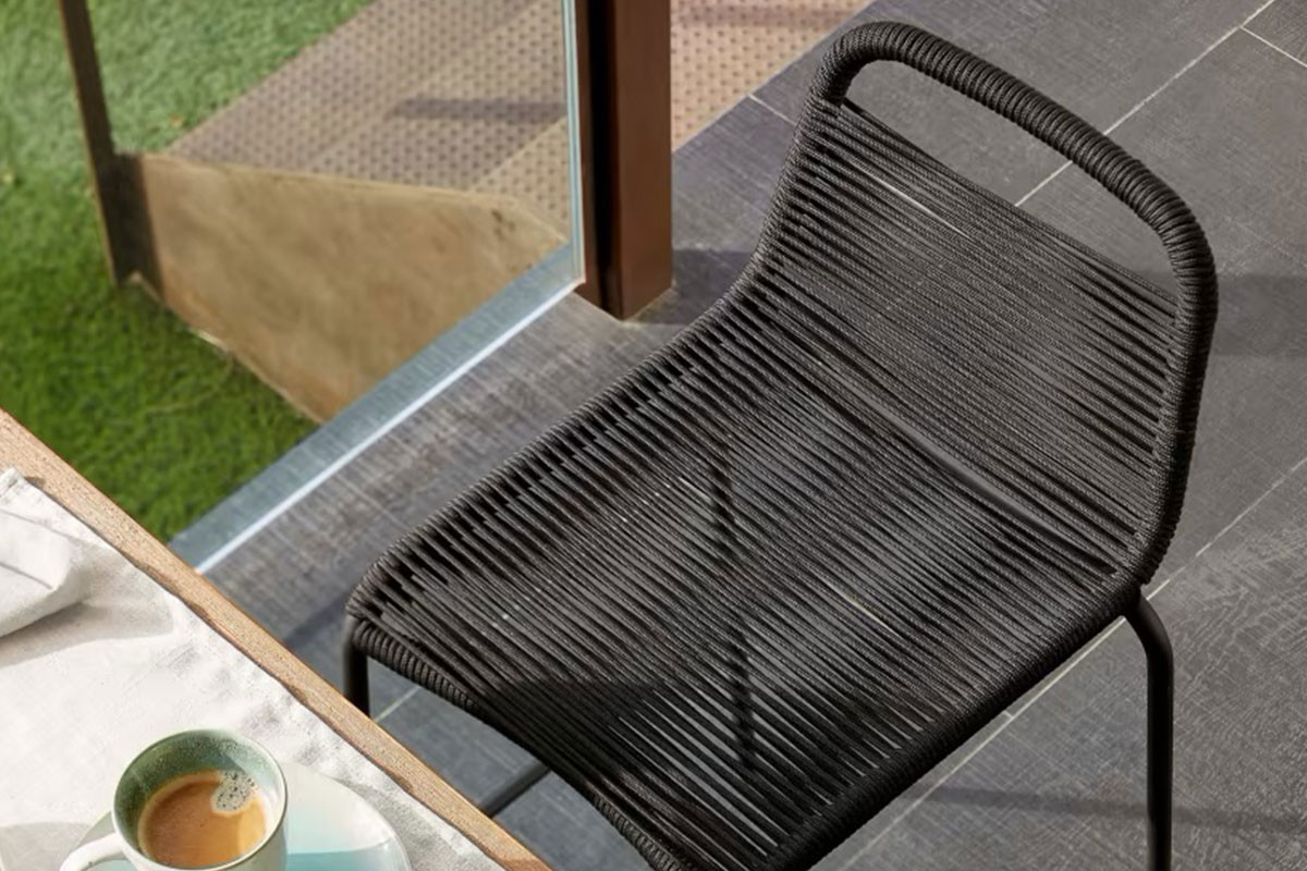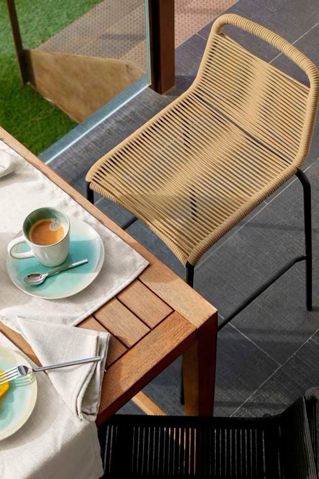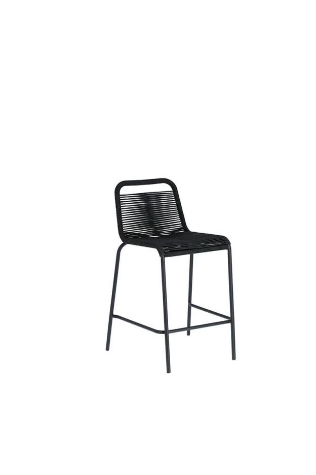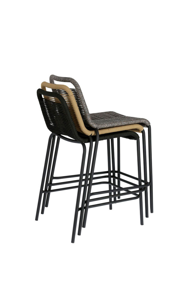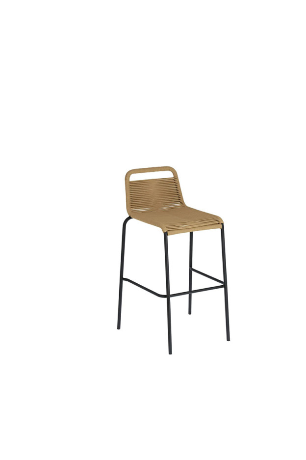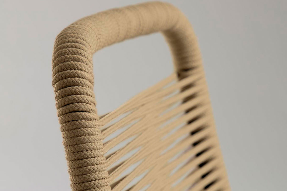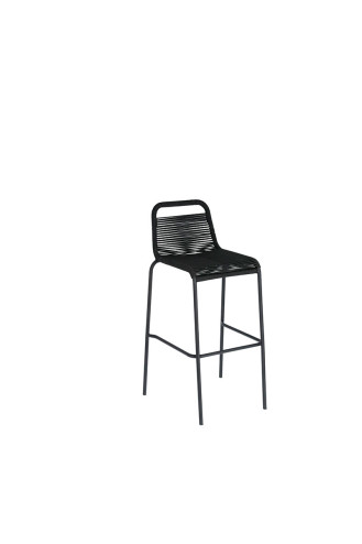 Taburete con estructura de acero galvanizado en color negro. Asiento y respaldo cordado a mano, cuerda disponible en diferentes colores. Apilable.