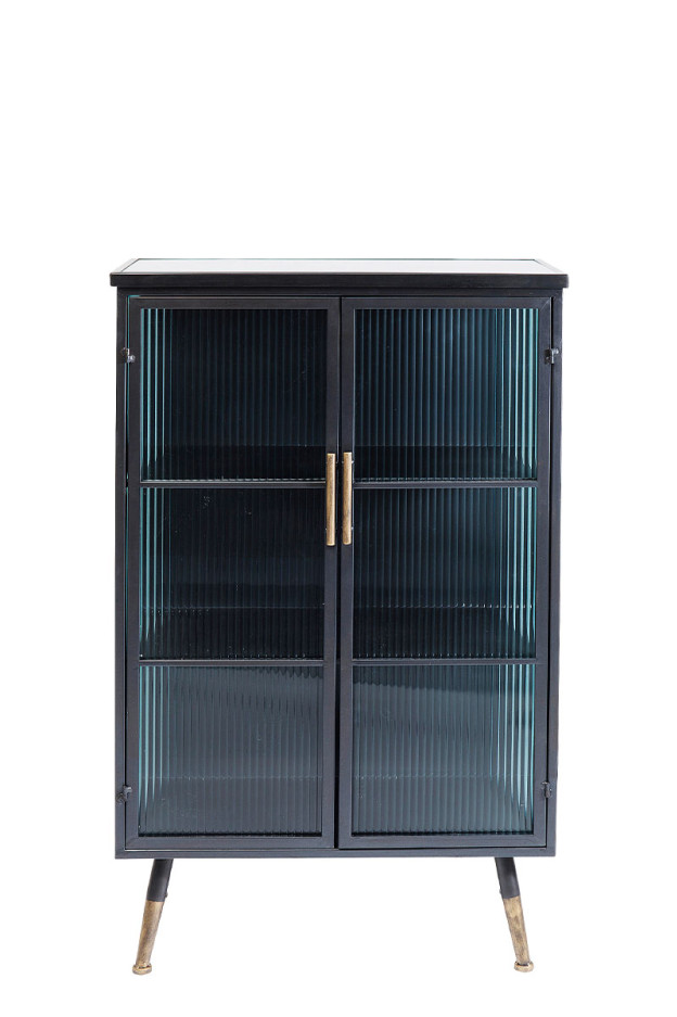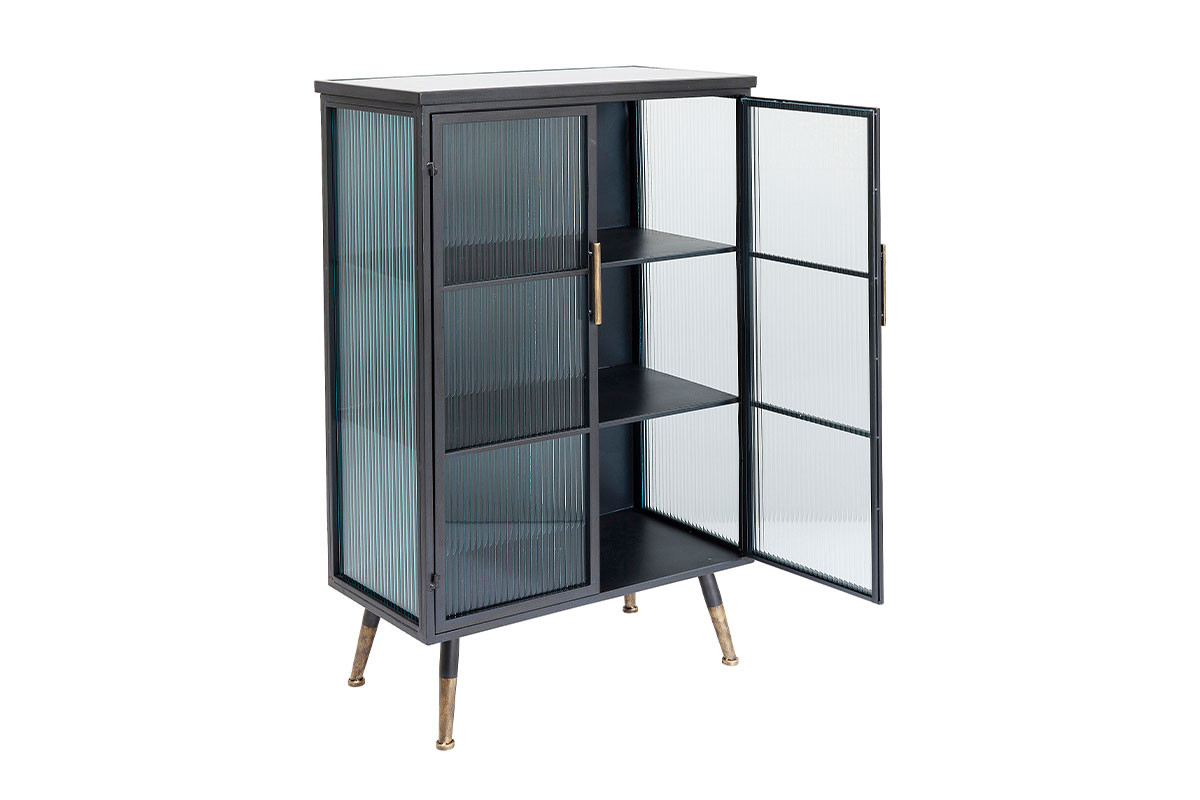 Acero revestido y vidrio, estos son los materiales utilizados para crear estas vitrinas con aire industrial. Cuerpo de MDF lacado, frentes de acero con recubrimiento en polvo, vidrio templado satinado de seguridad.